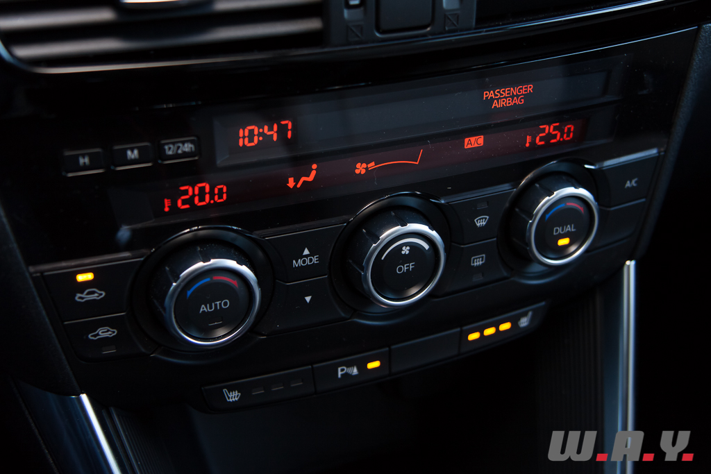 Les jours suivants, même sur route mouillée, le CX-5 restera imperturbable et les aides électroniques corrigeront le moment venu et si besoin est, sans se faire sentir. L’ABS est bien calibré et l’ensemble du freinage est suffisamment puissant pour freiner ce SUV qui, rappelons-le, est l’un des plus léger avec l’Audi Q5. Il est d’ailleurs recommandé, si vous voulez rouler vite dans des petites routes sinueuses, de rentrer dans les virages sur les freins afin d’éviter un maximum tout sous-virage prononcé comme souvent avec les SUV. Ce « poids moyen », associé à cette plate-forme révolutionnaire (utilisation accrue d’acier à haute résistance) et à un moteur extraordinaire de par son allonge et un amortissement ferme mais confortable, permet au CX-5 de ne pas prendre de roulis excessif. On se croirait à bord d’une limousine « haute sur pattes ». Vif et très réactif, le CX-5 surprend. Je ne parlerai pas de réel plaisir au volant de ce SUV car ces deux mots sont pour moi incompatibles, même si le S de SUV veut dire sport. Néanmoins, le CX-5 sort du lot en termes d’agrément général et il est un des SUV les plus agréables que j’ai pu tester jusqu’à présent. A noter qu’en ville et grâce à sa caméra de recul il se débrouille bien, mais comme avec tout SUV il faudra prévoir de quoi le stationner. Il bénéficie même d’un système anti-collision, valable en ville donc et ce jusqu’à 30 km/h. A noter aussi que même en position i-stop, par exemple lors d’un arrêt à un feu, une pompe électrique maintient le chauffage ou le refroidissement de l’habitacle.