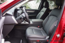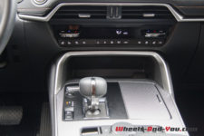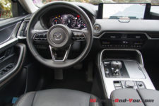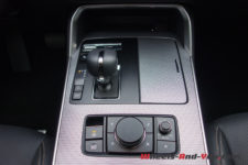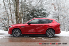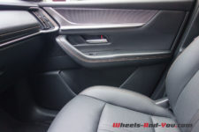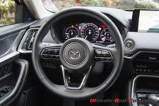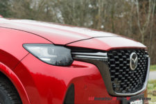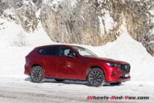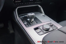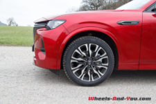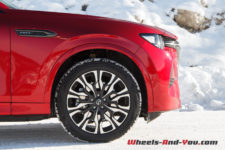 Dans cette finition haut de gamme « Homura » (qui signifie « feu »), le CX-60 est chaussé de pneus 20 pouces montés sur de belles jantes noir brillant accordées aux coques de rétroviseurs.