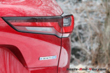 L’arrière est plus travaillé. Je le trouve beau avec ses feux LED qui s’étirent finement. Un béquet à double bossage en haut du hayon montre que le travail aérodynamique n’a pas été oublié. Le bouclier arrière intègre deux doubles sorties d’échappement rectangulaires teintées en noir brillant.