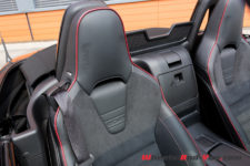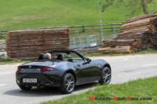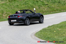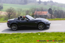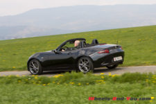 La voiture est donc très confortable tout en restant sportive. Oui oui, sportive. Car on peut prendre un bon 7’500 t/min avant que cela ne rupte, sans avoir vraiment l’impression que le couple baisse passé les 4’000 t/min. Hop, on passe la vitesse suivante et grâce aux 184 ch, qui sont bien là, la voiture continue ses envolées haut dans les tours. C’est jouissif. Il manque peut-être un son plus sportif, mais ce dernier, capote ouverte, délivre un son grave, rauque, celui d’un 2 litres et ce n’est pas si désagréable. Tout juste parfois à bas régime, une petite résonance se fait entendre, mais rien de bien méchant. Est-ce qu’une ligne du style « Record Monza » que possède l’Abarth 124 Spider serait mieux ? Pas certain, nous avons là un petit cabriolet qui se veut cool et se doit de ne pas en faire trop. Ce ne sera jamais une MX-5 « MPS » (qui n’a d’ailleurs jamais existé, mais les plus anciens comprendront) mais on n’en est pas loin, il suffirait de peu de chose.
