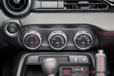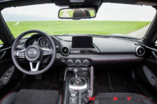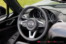 A l’essai aujourd’hui, nous avons un nouveau 2.0 l atmosphérique SkyActiv-G retravaillé qui évolue significativement par rapport à la génération précédente. Version coupleuse mais peut-être un peu trop « pépère » pour ce petit Roadster. Pas facile de faire évoluer un moteur ayant déjà un taux de compression très élevé de 13:1. Et pourtant, les ingénieurs de chez Mazda l’ont fait. Ce moteur gagne 24 ch et 5 Nm. Cela parait peu mais c’est un grand pas. Les 5 Nm en soi ne sont pas faramineux, mais on obtient les 205 Nm à 4’000 t/min au lieu des 4’600 t/min. Le régime maximum passe de 6’800 t/min à 7’500 t/min.