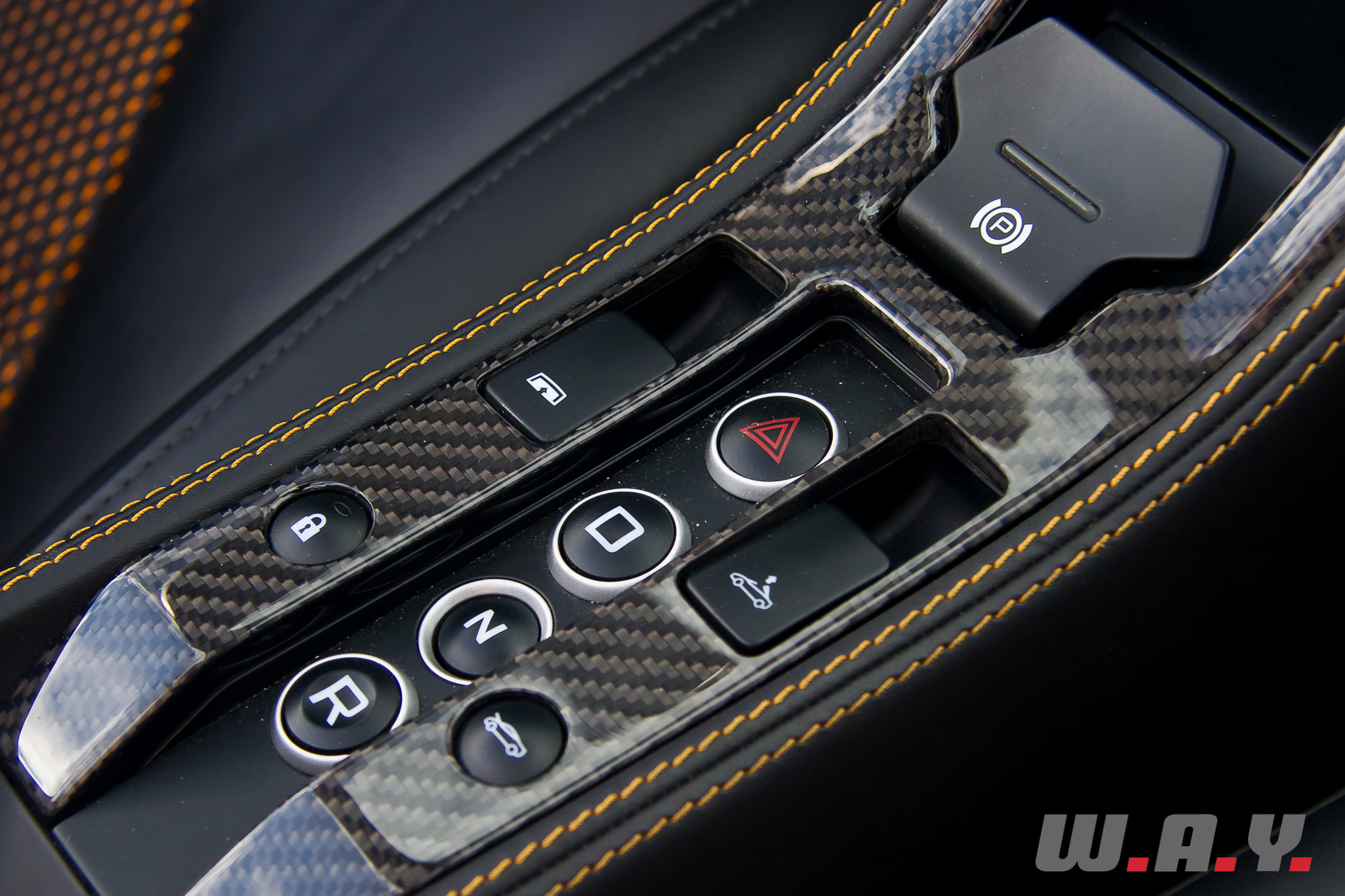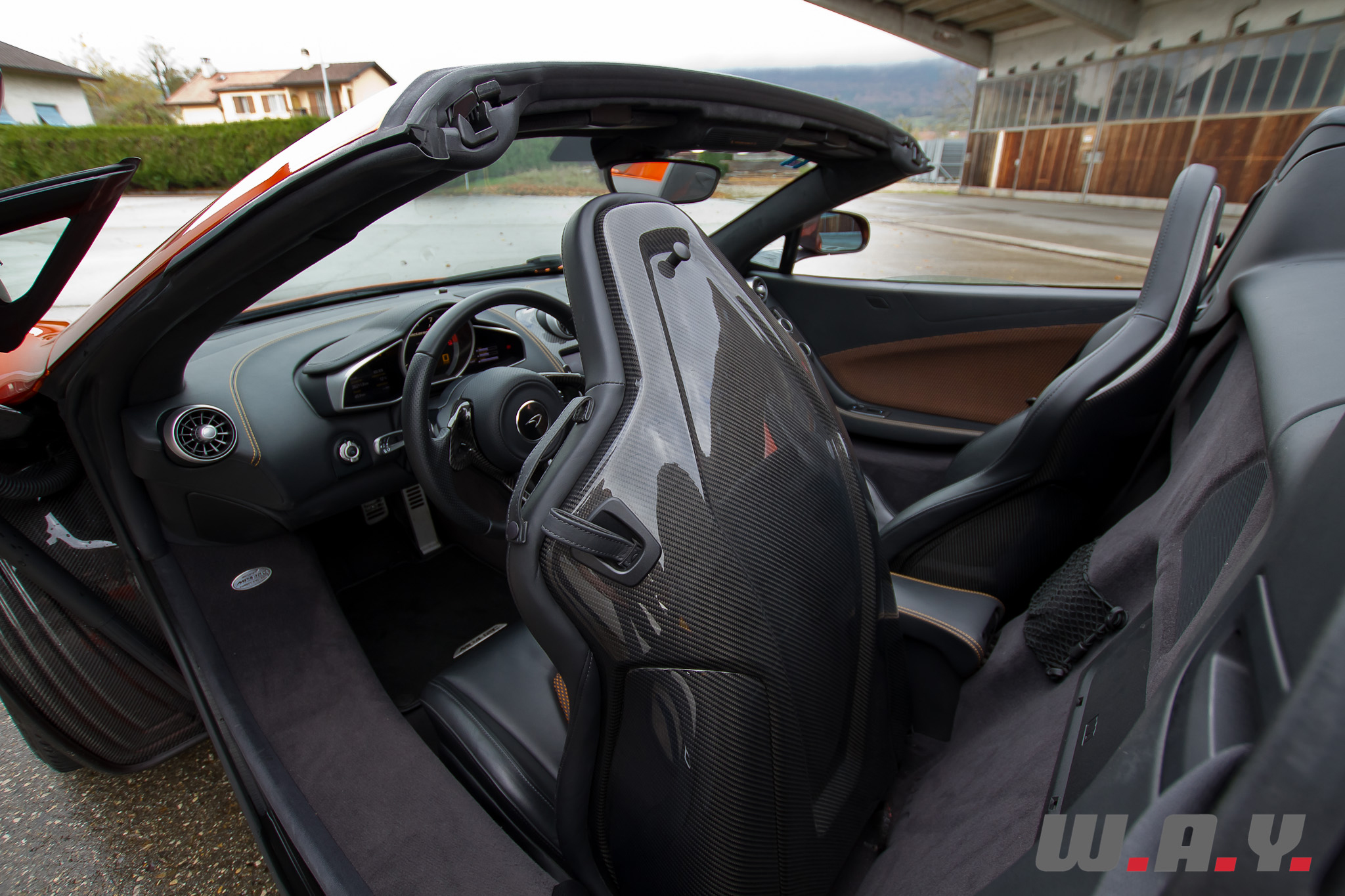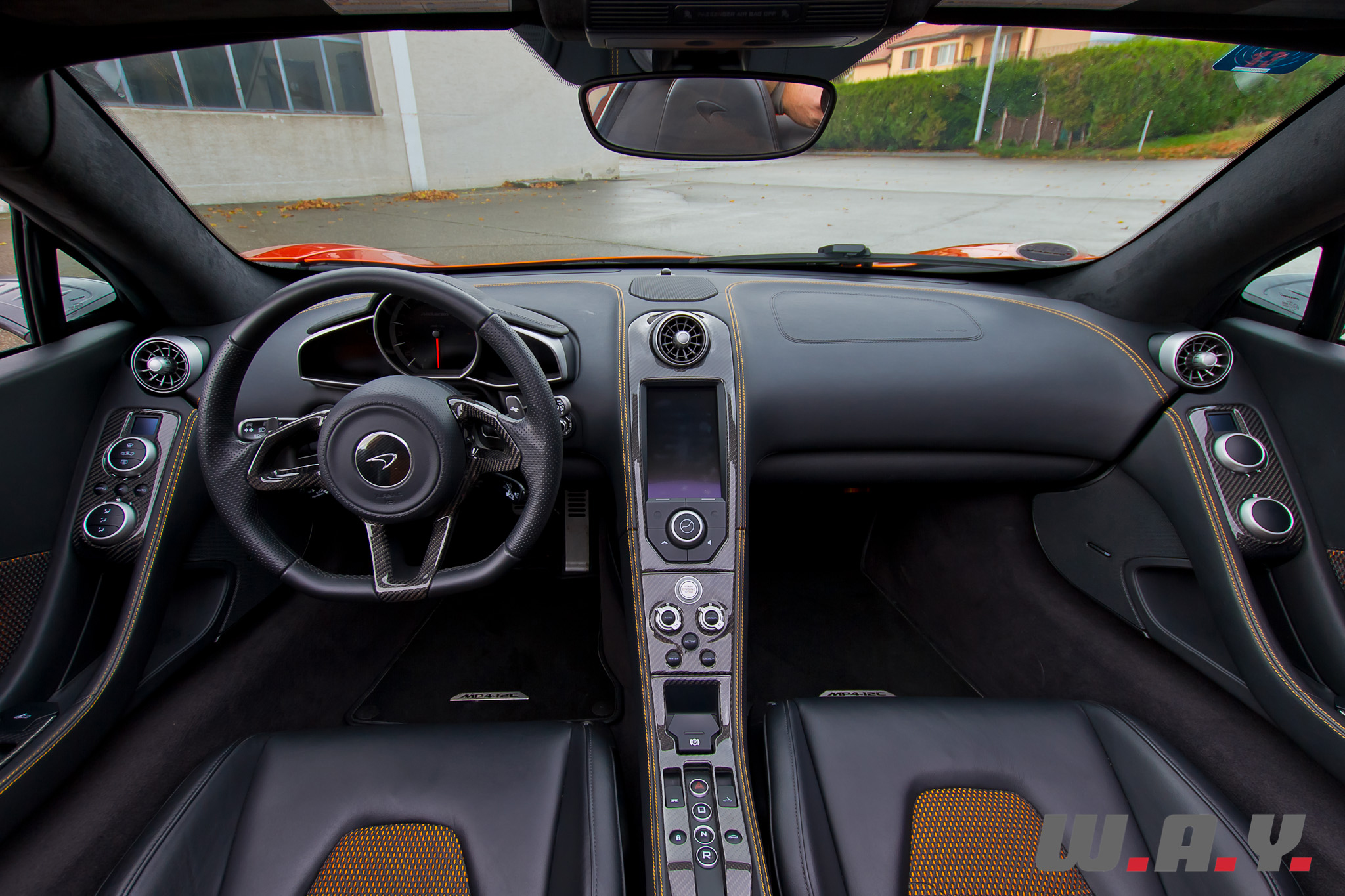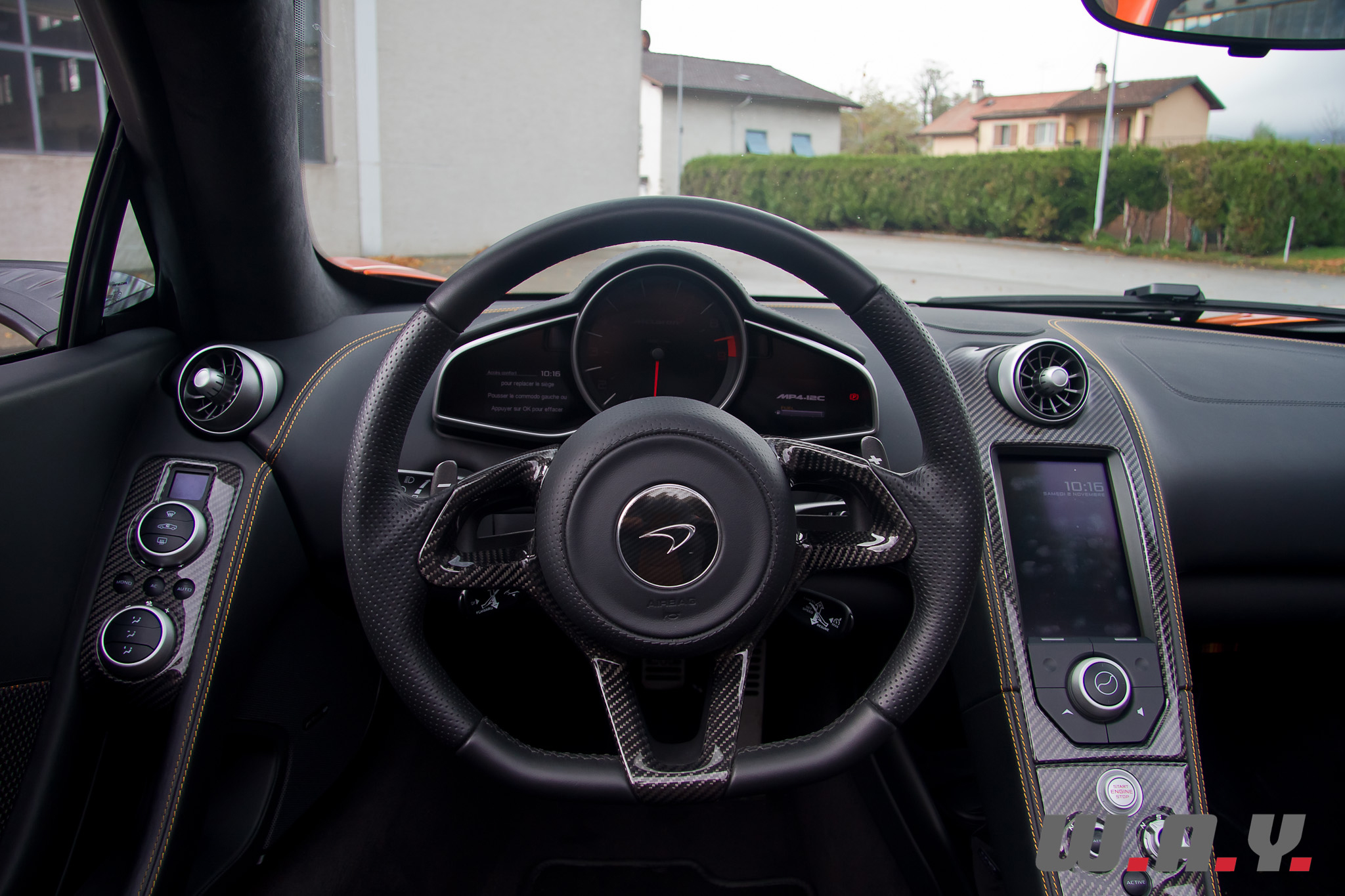 Je me glisse à bord de ce Spider et là aussi quasiment aucune différence par rapport au Coupé. Encore une fois, c’est la sobriété qui prime et le noir est omniprésent. Je noterai quand même la surpiqure orange ainsi que les dossiers de sièges revêtus, dans leur partie centrale, d’un treillis noir laissant transparaître un fond orange. Le constructeur appelle ça le tissu « Espace », un composant qui s’allie au cuir pour proposer une finition intérieure « Sport Cuir », idéale pour une conduite sur circuit puisque les sièges proposent ainsi un meilleur grip et une meilleure circulation de l’air. Certains trouveront ça moins élégant que du cuir ou de l’alcantara. Pour ma part je trouve effectivement que ça confère un côté plus sportif à l’habitacle. Les goûts et les couleurs… en tous les cas, je suis parfaitement installé au poste de pilotage, la position de conduite est rapidement trouvée, un parfait compromis entre le confort et un excellent maintien nécessaire à une conduite (très) sportive. Le volant et les palettes tombent parfaitement sous les mains, un véritable appel à démarrer et partir avaler des kilomètres et des kilomètres d’asphalte. Comme pour l’extérieur, l’habitacle de notre 12C Spider disposait de plusieurs éléments en fibre de carbone, un régal pour les yeux mais moins pour votre porte-monnaie.