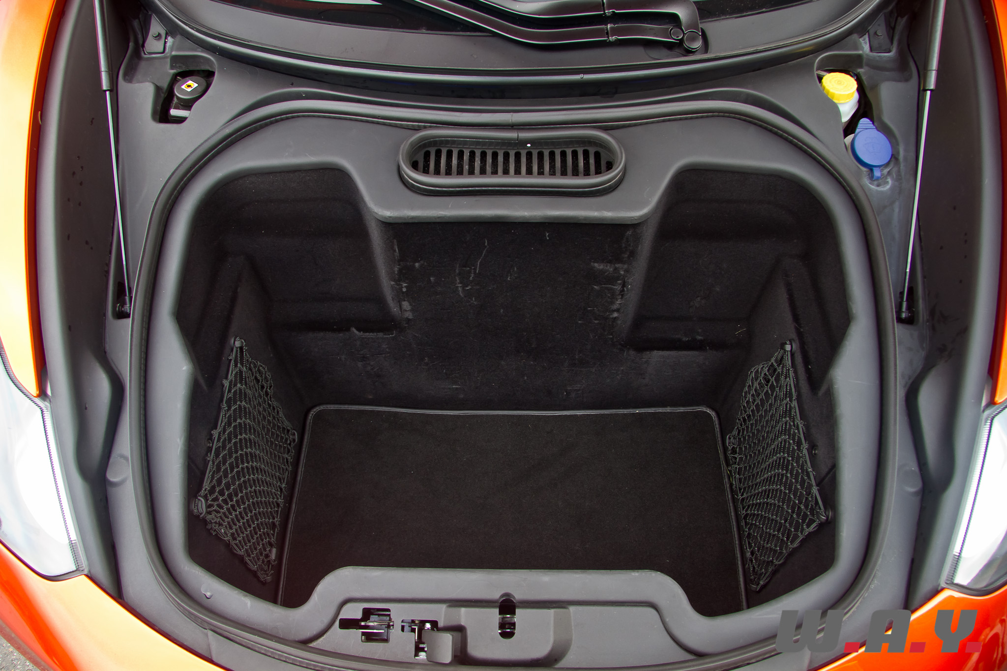 Moteur central oblige, le coffre se trouve à l’avant avec une contenance de seulement 145 litres. Toutefois, comme je vous le disais précédemment, avantage de cette version Spider, l’espace réservé au rangement du toit peut s’utiliser comme coffre supplémentaire avec un volume de 52 litres. De plus, deux valises prévues pour cet espace sont livrées en série avec la voiture. Vous auriez tort de ne pas en profiter pour vos virées en week-end et il suffira de les laisser à l’hôtel pour profiter, cheveux au vent, de la région visitée. Cet astucieux rangement s’actionne à l’aide de deux boutons situés à l’intérieur de la porte conducteur, uniquement quand le toit est fermé bien évidemment.