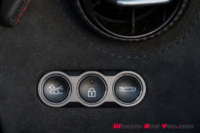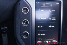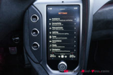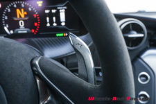 Au centre, l’écran vertical typique McLaren est toujours présent mais les deux boutons rotatifs de la 720S laissent place à trois boutons poussoir : le premier pour l’aéro – j’y reviens plus loin – le second orné du « Speedy Kiwi » qui offre un accès direct au mode individuel qu’on peut programmer à sa guise et le troisième pour accéder au launch control. Bien entendu, je retrouve les trois touches superposées qui gèrent la boîte et le gros bouton de démarrage. L’infotainment intègre dorénavant Apple CarPlay, mais pas encore Android Auto.