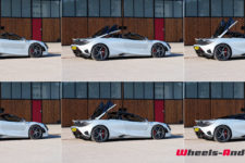 C’est essentiellement l’avant qui évolue pour gommer une imperfection de la 720S : un avant qui crée trop de portance au-delà de 200 km/h. Ainsi, le bouclier avant est redessiné, avec des phares – qui sont aussi des entrées d’air pour les radiateurs – 3 cm moins large, une lame avant plus prononcée et des entrées d’air inférieures plus effilées. En option, les ailes voient également l’apparition de « louvers », des persiennes empruntées à la 765LT qui diminuent la surpression générée par la vitesse dans les passages de roue. Ainsi, au-dessus de 200 km/h, l’effet de soulèvement est réduit et l’efficacité du train avant renforcée.