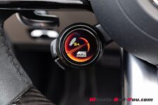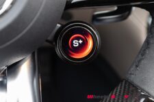 Le volant lui-même est passablement encombré. Les deux branches horizontales sont remplies de boutons et surfaces tactiles pour le contrôle des compteurs virtuels, du régulateur de vitesse à gauche et de l’installation stéréo et téléphone à droite. On y trouve également deux commandes rotatives pour la sélection des modes de conduite et l’ajustement des paramètres du châssis, du moteur et de la transmission.