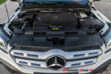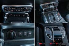 Le cockpit reprend les éléments déjà découverts sur les derniers modèles Mercedes : grand écran digital rapporté sur la planche de bord, bouches d’aération circulaires, nombreux éléments en plastique argenté, on est bien dans une Mercedes moderne. Et j’avoue que la qualité perçue est plutôt bonne malgré certains plastiques durs et facilement rayables. Les commandes de clignotants et essuie-glaces sont regroupées sur un unique commodo situé à gauche du volant, une conception typée américaine où cette ergonomie est légion. Au-dessous, un second levier est destiné au régulateur de vitesse. Je trouve son ergonomie pas optimale comparée aux plus courants contrôles par 2-3 boutons sur le volant.