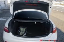 Le profil est agréable à regarder. Les lignes sont coulantes et la hauteur de la ligne de caisse laisse peu de place aux surfaces vitrées. Les proportions sont agréables, mais je trouve l’ensemble assez consensuel. Pour ma part, c’est de trois quarts arrière que je préfère admirer ce coupé. En effet, les feux horizontaux s’étirant sur les ailes arrière sont du plus bel effet tandis que les deux sorties d’échappement intégrées dans le diffuseur agrémentent joliment le pare-choc. Les jantes de 20 pouces au design sobre et classieux ajoutent tant à la sportivité qu’à l’élégance de l’ensemble. Elles posent également l’auto sur le bitume. Le pare-brise est oblique et ses montants sont larges. Je constate d’ailleurs assez vite que cela gêne un peu la visibilité de trois-quarts gauche.