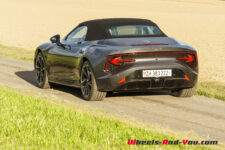 L’arrière est plus angulaire mais c’est cette partie que j’apprécie le plus, notamment la signature lumineuse avec des flèches en guise de clignotant ; c’est très réussi. Je relève aussi que l’auto est tout aussi belle avec ou sans la capote en place, les designers ont vraiment eu un excellent coup de crayon.