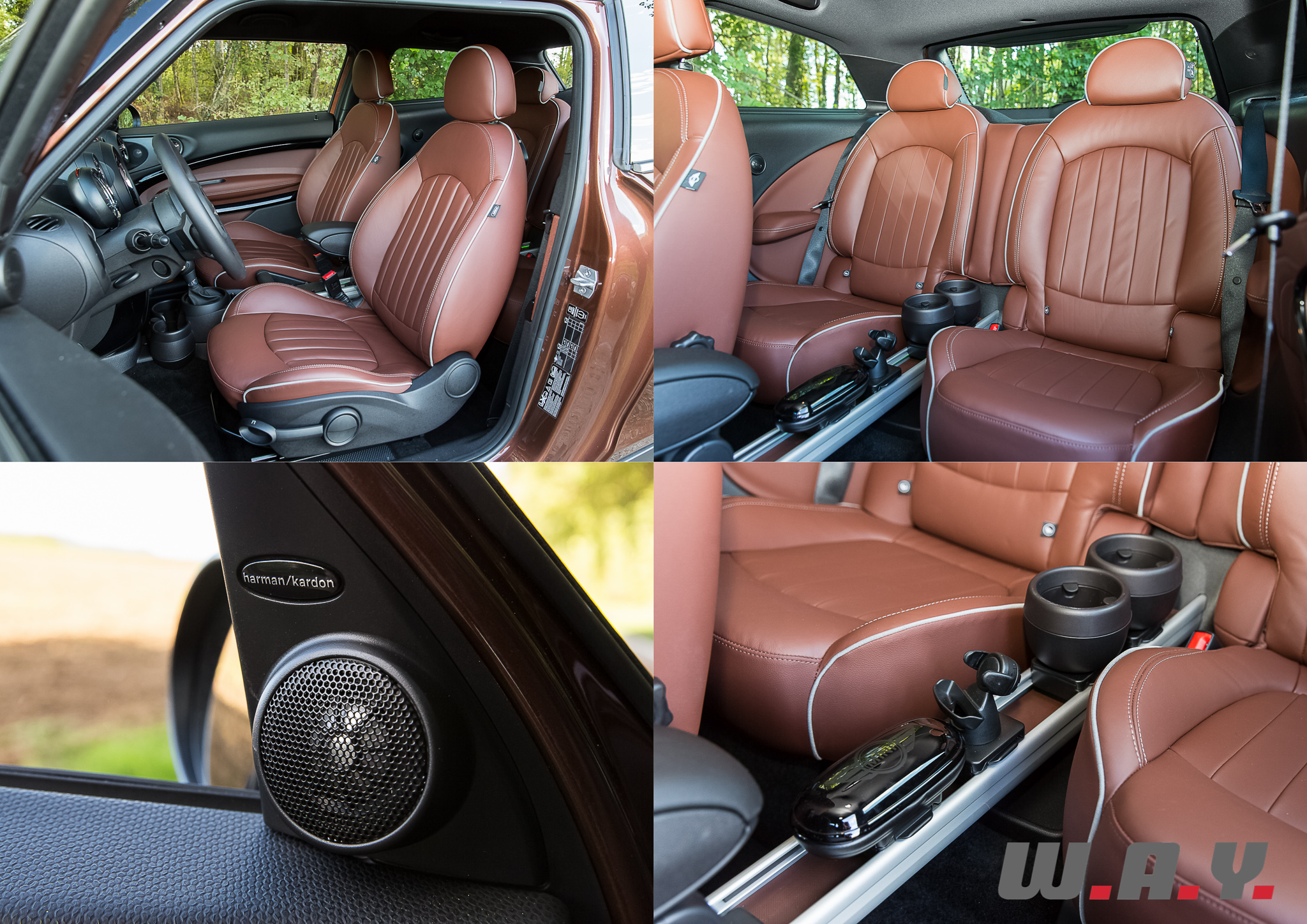A l’arrière, on trouvera des feux placés horizontalement ; plus larges et plus étirés que ceux positionnés sur le Countryman. Cela lui confère un aspect plus trapu, associé à une lunette arrière inclinée façon coupé ainsi que deux sorties d’échappement rondes qui finissent par bien donner le ton : c’est une sportive. Dommage qu’il y ait, et ce pour la première fois, ce logo aussi gros qui trône au milieu du coffre ainsi que l’appellation du modèle. A croire que les marques actuelles nous prennent pour des « bigleux ». Ils ont tort, car il est souvent plus payant de pousser à chercher à quelle marque on a affaire que de l’apporter sur un plateau. Ici on ne vous collera pas au c… pour vous identifier !
