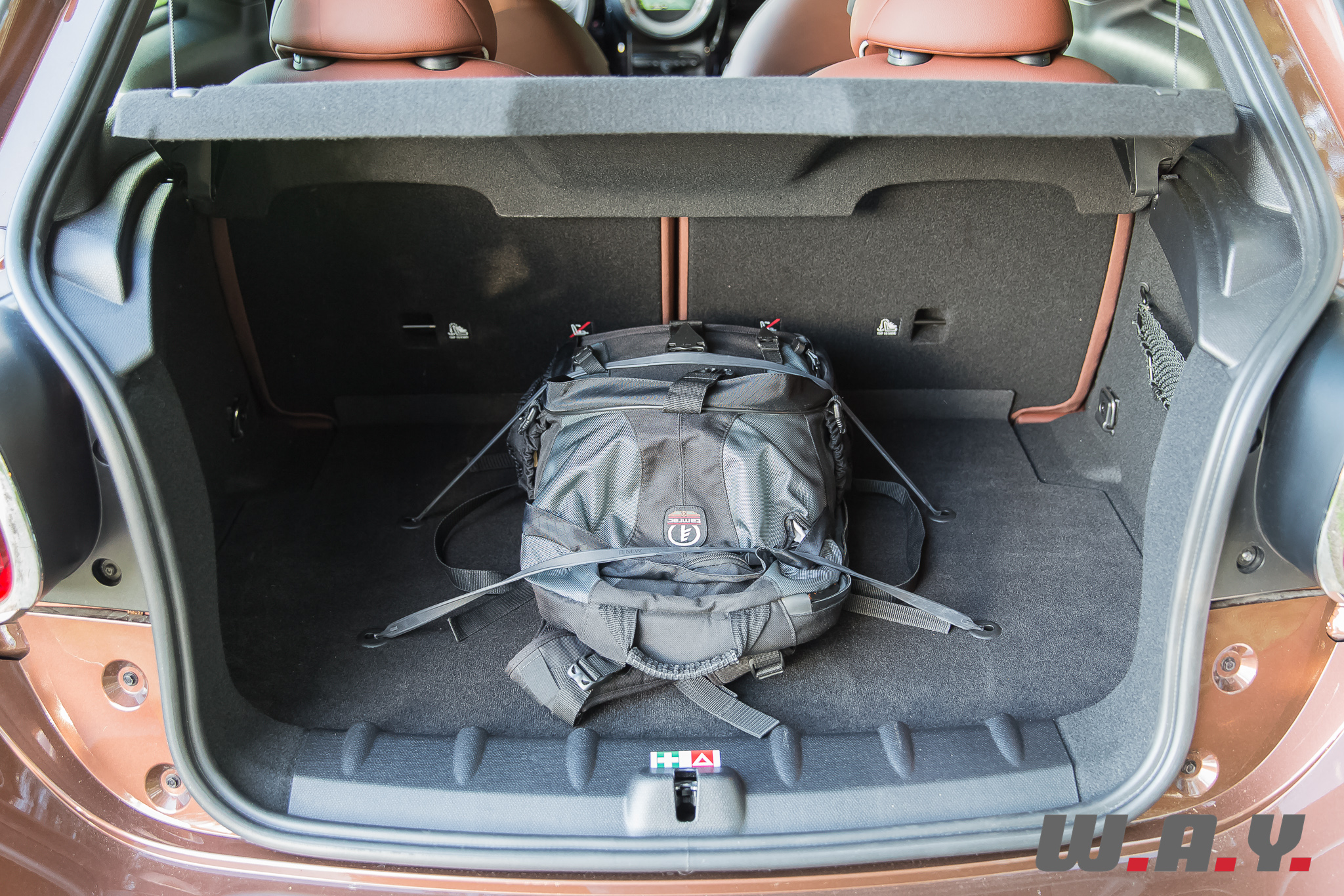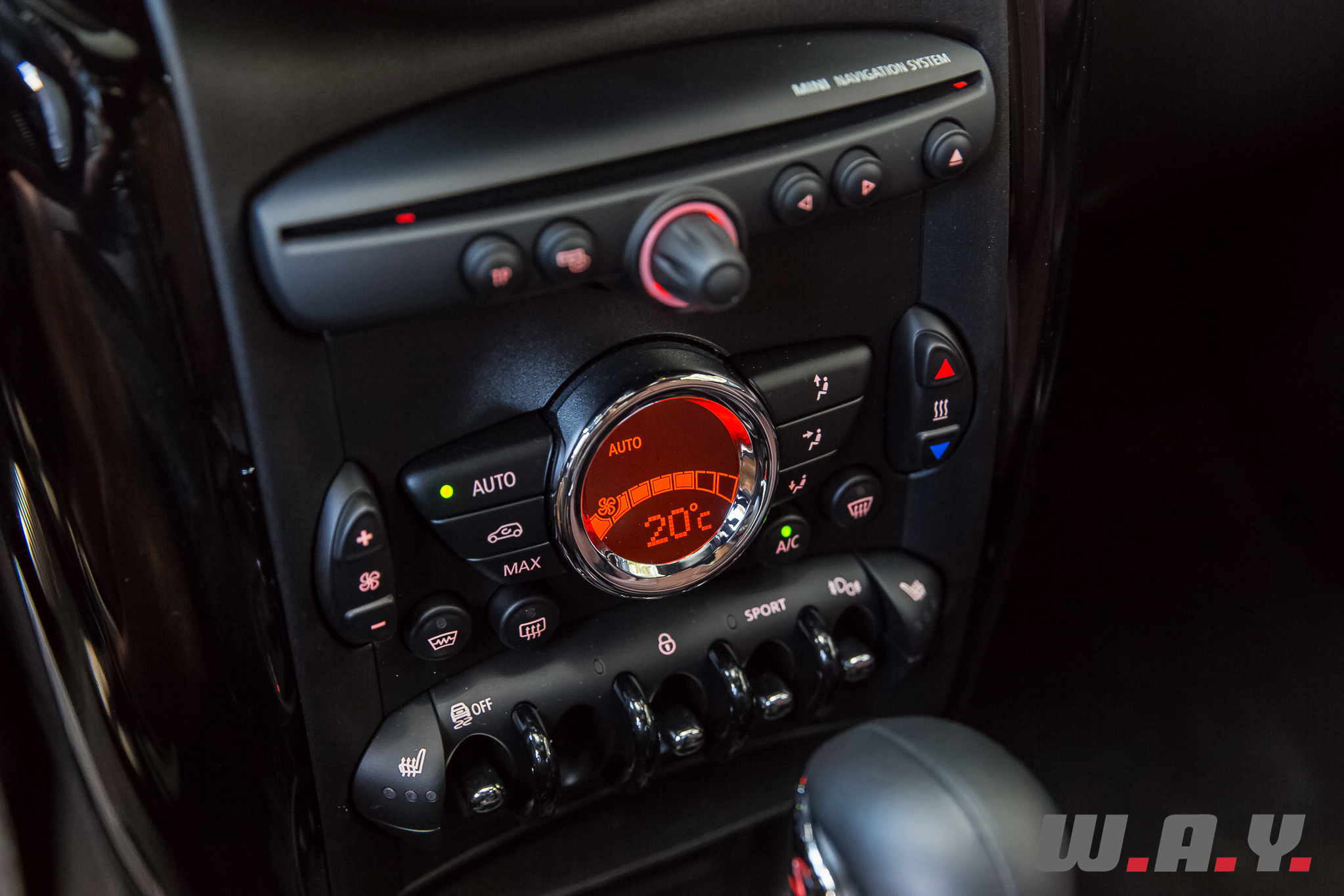 L’intérieur ne dépaysera pas les “néo-Mini praticiens”. On retrouve les petits interrupteurs chromés type “aviation” du plus bel effet sur la console centrale. Seuls les poussoirs pour les vitres ont bougé. Ils ont migré vers les contre-portières. Un éclairage d’ambiance en liaison avec l’option “pack d’éclairage” offre la possibilité de changer de couleur en continu, y compris sur le rail central présent à l’avant comme à l’arrière.