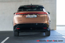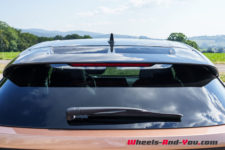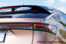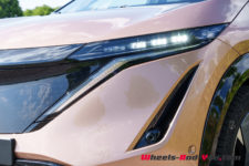 L’imposante face avant est verticale et presque exempte d’ouvertures. Elle est ornée de dessins géométriques sur les tiers extérieurs qui rejoignent le regard en V formé par les feux de jour. Le pavillon de toit entièrement vitré descend sur l’arrière, donnant un faux air de coupé à l’Ariya. Il intègre un toit ouvrant et un becquet qui paraît presque suspendu sur le pare-brise arrière alors que les feux LED ne forme qu’un large bandeau traversant toute la face arrière. Globalement et malgré son look semblant venir du futur, je trouve le design homogène et j’aime plutôt bien.