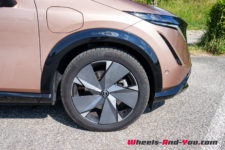 L’Ariya existe autant en 4×2 (traction) que 4×4 e-4ORCE et avec deux capacités de batteries : 67 ou 87 kWh. Le version 4×2 et 67 kWh développe 160 kW (équivalant à 217 ch) et 300 Nm. La version 4×2 et 87 kWh de mon essai propose 178 kW (242 ch) et également 300 Nm alors que les deux moteurs conjugués au système e-4ORCE développent 225 kW (306 ch) et 600 Nm. Leurs consommations normalisées sont respectivement de 17.1, 17.3 et 19.4 kWh/100 km, ce qui correspond à des autonomies WLTP de 414, 544 et 498 km, des valeurs théoriques parmi les meilleures dans le segment.