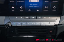 Sous cet écran, Opel maintient une série de touches physiques qui agissent comme des raccourcis des commandes disponibles à l’écran. Ainsi, les réglages de climatisation comme la température, la ventilation, la climatisation, le recyclage d’air, le retour au menu principal ou l’accès aux assistances de conduite sont directement accessibles. Bien plus ergonomique que le tout tactile !