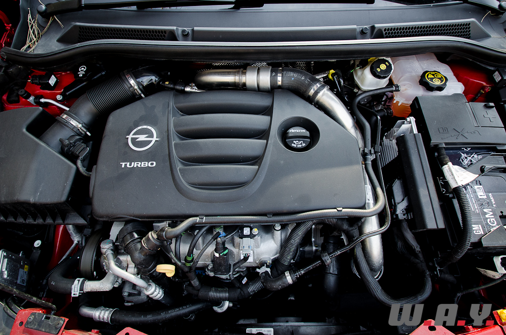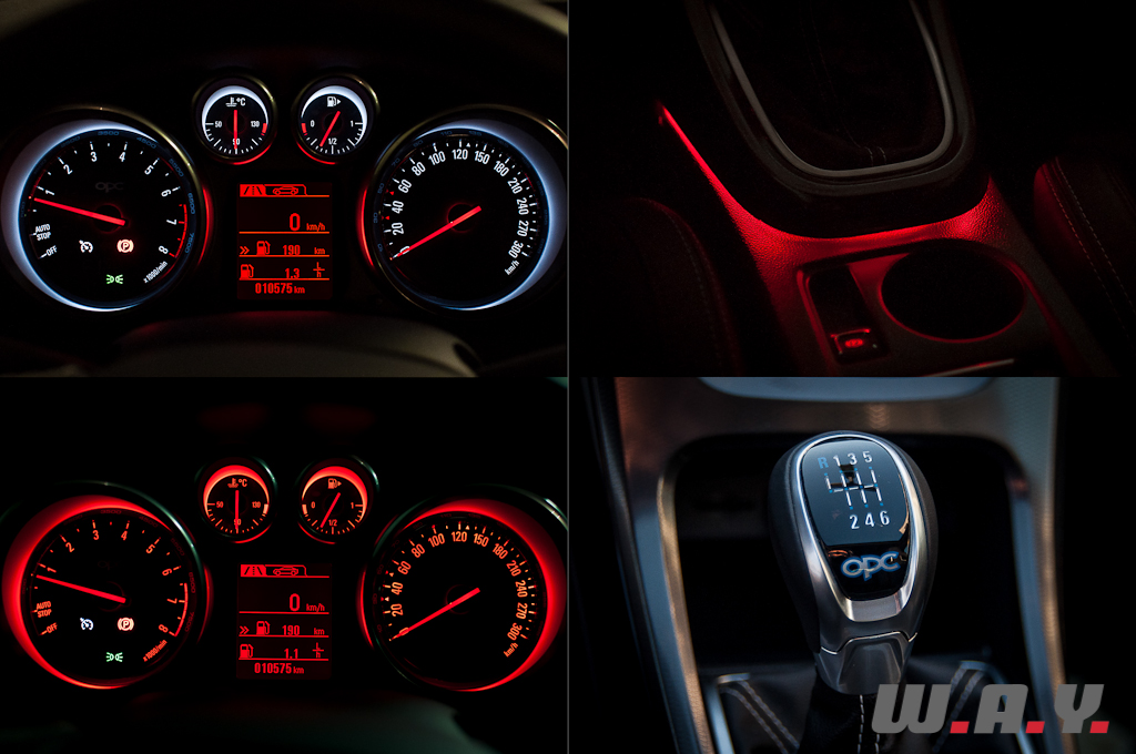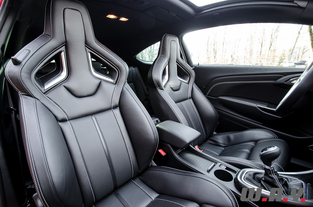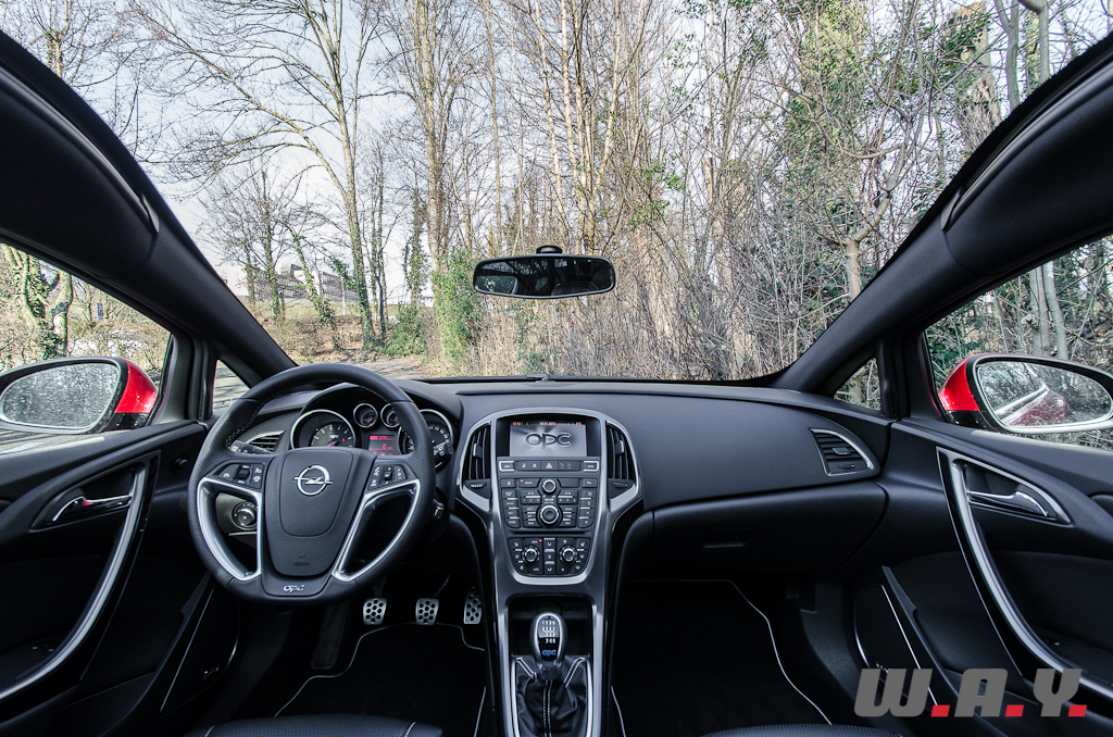 Je tourne la clé. Premier constat : ça sonne fort et ça sonne bien. Messieurs les ingénieurs Opel, chapeau bas, le son émis par ce quatre cylindres dans les bas régimes est digne des feulements de fauves bien plus musclés en cylindrée. Je sors du parking. Dès les premiers changements de rapports, l’accoudoir central, que j’ai déjà reculé au maximum, me dérange. En conduite sportive, la seule solution pour moi sera de l’ouvrir ce qui aura pour but de libérer l’espace nécessaire au bon déploiement de mon bras. Il faut dire que de par mon gabarit (195 cm) j’ai les bras longs. A ce sujet, notons que mise à part cette légère gêne, les multiples réglages des excellents sièges et du volant me permettent sans soucis de trouver une position de conduite optimale, avec encore une bonne réserve d’espace en profondeur et en hauteur grâce à l’assise abaissée de 17nmm par rapport au modèle précédent.