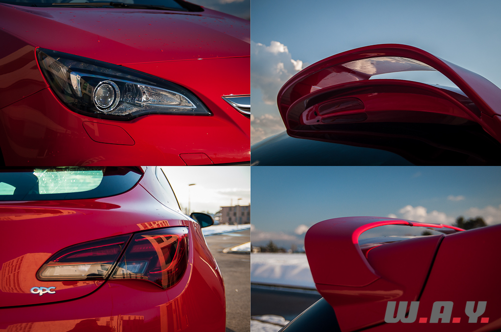 Très sportive, la face avant annonce la couleur avec les deux entrées d’air latérales cerclées de gris entourant cette large bouche noire comblée par une grille en nid d’abeille constituée de maillons de taille généreuse. Quoique dans une moindre mesure, les phares et la calandre ont également été retouchés. L’arrière demeure tout aussi sportif surtout lorsque l’on est en présence d’une auto munie du pack « Design OPC », comprenant entre autre le becquet supplémentaire couleur carrosserie, qui pour certains sera de trop car cassant la ligne dynamique de base de profil. Exit la sortie d’échappement centrale pour laisser place à un large diffuseur qui n’est pas sans rappeler certaines voitures de course. Les sorties d’échappement sont donc placées sur les bords et toujours à travers des embouts finaux en chrome satiné et profilés au diffuseur, conférant à l’ensemble à la fois fluidité et élégance.