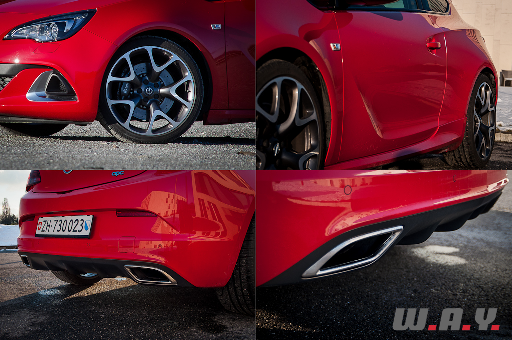 Le badge OPC est souvent synonyme de changement de plastique par rapport au modèle de série et l’Astra ne déroge pas à la règle. Et il ne sera pas simple de passer inaperçu au volant de cette Astra, surtout lorsque celle-ci se présente à moi dans un rouge brillant très « flashy ». Peut-être pas le coloris le plus heureux, mais passons. Par rapport au modèle de base, signalons en premier lieu les magnifiques jantes en alliage de 20’’ (CHF 1’100.-), qui laissent entrevoir les freins surdimensionnés Brembo à 4 pistons et disques percés de 355 mm de diamètre.