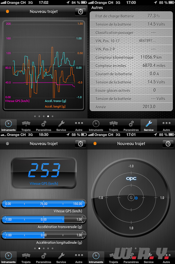 Grâce à une application pour smarphone dédiée (« OPC », disponible sur AppStore pour CHF 1.-), il est possible de se connecter par Wi-Fi (et non Bluetooth) à la voiture afin de pouvoir avoir accès à certaines données du moteur, habituellement réservées aux outils de diagnostic. Il est alors possible de consulter l’état de charge de la batterie ainsi que sa tension, la pression des pneus, les différentes températures moteur, etc., le tout en cours de route. De plus, prévue pour une utilisation sur circuit, l’application permet d’afficher  et d’enregistrer la vitesse réelle ainsi que les accélérations latérales et longitudinales, les chronos au tour, et également la durée du trajet ainsi que le nombre de kilomètres parcourus et tracés sur la carte Google Maps. Seule ombre au tableau, l’application n’affiche aucune information au sujet de la consommation d’essence.
