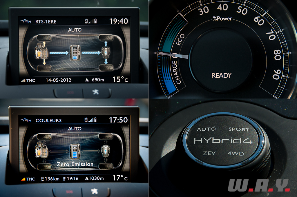 La plupart du temps le mode « AUTO » est privilégié, le système exploitant de façon optimale les moteurs thermique et électrique. Inutile de se poser de question, il suffit d’opter pour une éco-conduite pour réduire significativement la consommation et les émissions de CO2. Sur autoroute cependant, la 3008 HYbrid4 devient un diesel traditionnel car le moteur électrique reste inactif au-delà de 120 km/h. En-dessous de cette vitesse, le moteur électrique agit lors des changements de rapports principalement pour éviter les ruptures de couple de la boîte de vitesses, mais sans pour autant annihiler totalement les à-coups, surtout en mode « SPORT ».