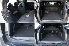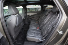 Grâce au grand toit vitré, l’habitacle est logiquement lumineux. De nuit, l’éclairage d’ambiance est aussi une réussite. On découvre une superbe sellerie en cuir, surpiquée d’un motif assez chic. La deuxième rangée est en 2 tiers – 1 tiers avec dossier inclinable et assise coulissante. Ces passagers profitent de bouches d’aérations dédiées ainsi que de prises USB facilement accessibles et 2 trappes de rangement sous le plancher. Deux dernières places sont installées en option dans le plancher du coffre, réduisant de 80 litres le volume disponible.