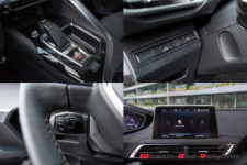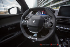 Le style adopté par la marque du lion depuis un certain temps est efficace et séduisant. L’ensemble est élégant, avec de l’alu brossé, des inserts style bois de couleur très claire et du plastique piano noir. Face au passager, la planche de bord s’étire pour donner un maximum d’espace, ce que je trouve très réussi. Côté conducteur, le petit volant surprend au premier regard mais se révèle adapté à l’usage.