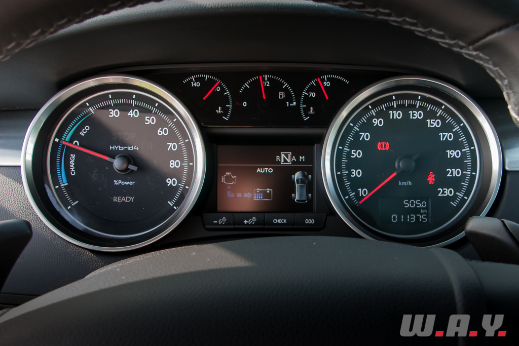 Le compte-tours est remplacé par un pourcentage de puissance utilisé, avec des zones indiquant quand le moteur thermique est à l’arrêt ou quand le moteur électrique se recharge, un gadget sympa mais il me manque toujours le compte-tours. Dès les premiers mètres, on sent que nous sommes dans une voiture au confort bien maîtrisé, le moteur marche suffisamment bien mais cette boîte à vitesses est une véritable catastrophe, une lenteur indigne des voitures du XXIe siècle. Cette transmission manque de réactivité, de précision et lorsque l’on passe en mode manuel, cela est guère mieux mis à part le fait que nous pouvons quand même lui ordonner de faire ce que nous désirons. Mais prévoyez bien quelques dixièmes de secondes avant qu’elle n’exécute ce qu’on lui demande.