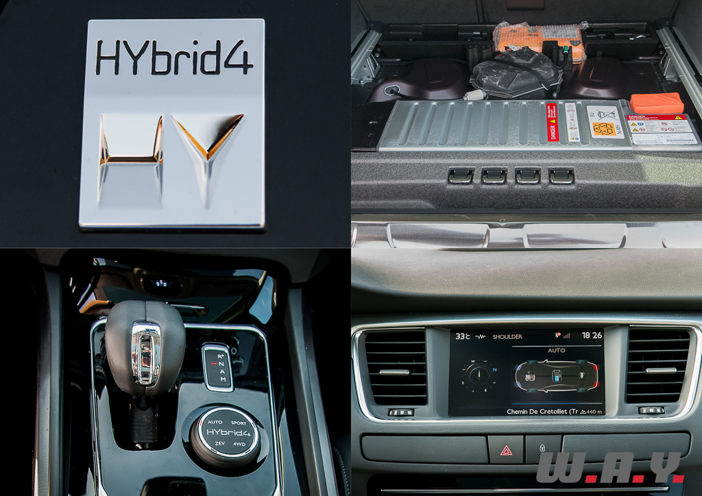 Sur la partie centrale du tableau de bord, un écran de 7 pouces regroupe GPS, afficheur du moteur électrique avec histogramme des consommations et schéma de l’utilisation des deux motorisations. En-dessous de ce moniteur, nous trouvons un bloc de commande pour la radio/CD et un bloc pour la climatisation bi-zone (4 zones en option). Sur l’imposante console centrale, se trouve un minuscule levier de commande pour la boîte à vitesses et un bouton rotatif qui commande quatre modes de conduite : Auto, Sport, 4WD et ZEV. Le bémol au sujet de l’habitacle concerne les parties en plastique noir vernis sur la console centrale ou autour de la radio qui sont constamment marquées par nos mains pleines de doigts.