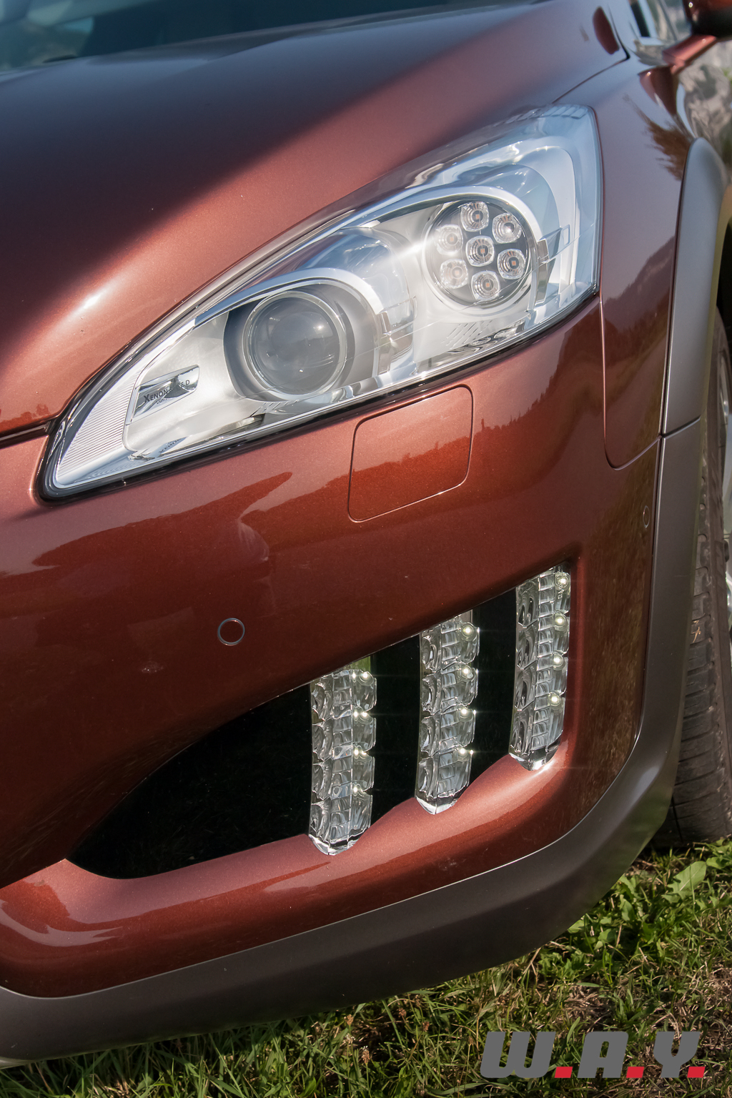 La version RXH de la Peugeot 508 est reconnaissable au premier coup d’œil. Nous avons affaire à un break 508 surélevé de 5 cm, avec des protections plastique sur tout le pourtour de la carrosserie, des jantes de 18 pouces au design unique et deux triples barrettes verticales de LED blanches logées aux extrémités du bouclier avant.