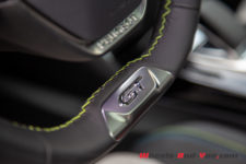 Avec la finition GT viennent aussi les sièges dynamiques qui ressemblent à des baquets, couverts de trois matériaux dont de l’Alcantara Gris Gréval et des surpiqûres vertes et bleues. Le rendu est chic et valorisant. Ces sièges sont confortables et réglables manuellement.
