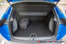 L’espace sous le capot moteur de la e-2008 n’est pas très rempli, probablement qu’en version thermique il y a moins de vide. On y trouve une batterie 12 volts et le moteur électrique synchrone à aimants permanents. Il développe 136 ch et 260 Nm de couple quasi instantanément. Les batteries d’une capacité totale de 50 kWh sont, elles, logées dans le plancher, sous les sièges. Ainsi le volume de chargement du coffre et la place dans l’habitacle ne sont pas impactés.