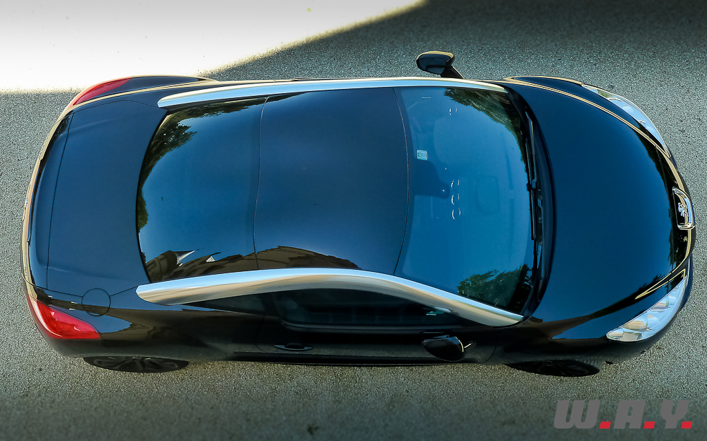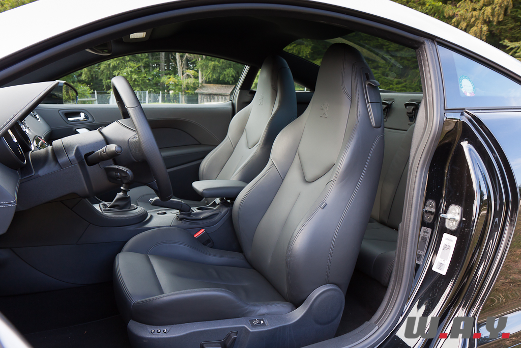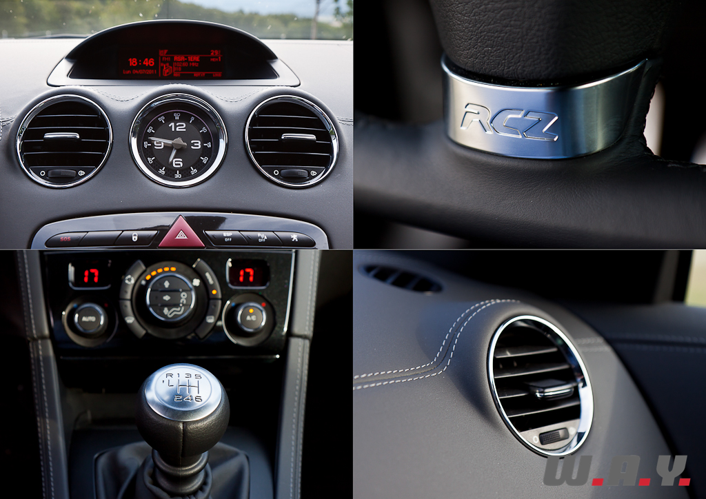 Il pleut à torrents au moment où je prends possession du coupé RCZ qui sera mien pour les prochains jours. Sa robe, toute de noir vêtue et ses très belles jantes 19″ de la même couleur lui confèrent une apparence très féline, voire mystique par cette météo très sombre. Habitué des chats noirs, je ne fais pas cas de ce sentiment et j’aurai plus le temps de l’admirer le lendemain. Aurais-je dû utiliser le terme « contempler » plutôt ? Car si pour beaucoup de personnes le look de cette RCZ ne plaît pas, je suis pour ma part conquis. Je trouve ses lignes dynamiques et racées, presque agressives, telles le lion de l’emblème Peugeot. En fait il n’y a que sa face avant, en totale adéquation avec l’identité de la marque, qui ne me plaît guère. Mais l’originalité a ses limites et de nos jours il est primordial pour les constructeurs d’afficher une continuité stylistique entre les modèles d’une même marque. Les courbes sont fluides et depuis l’intérieur, en regardant dans les rétroviseurs, la vision des ailes arrière galbées est simplement sublime. Sa poupe relativement longue, ses ailes bombées et la double sortie d’échappement accentuent la sportivité de la voiture. Les arches de toit en aluminium séparent avec succès la carrosserie et le toit à double bosselage. Au sujet de ce dernier, le designer de la RCZ, Boris Reinmöller du centre de style Peugeot, explique qu’il s’est inspiré de la 908 qui a participé au 24 Heures du Mans en 2007. A mes yeux, avec en plus le « Z » à la fin de son appellation, impossible de ne pas penser immédiatement au légendaire carrossier italien Zagato. Coïncidence ou hommage, cela n’a pas d’importance, le résultat est là, cette RCZ est une vraie réussite. Gage de ce succès, elle a reçu le prix de la plus belle voiture de l’année 2009 décerné par le Festival Automobile International.