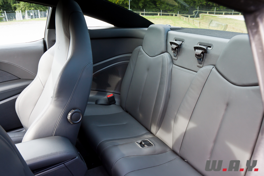 Une fois installé à bord, je découvre progressivement l’espace confiné de cette RCZ. La garde au toit est relativement restreinte et avec la teinte noire omniprésente, un claustrophobe ne s’y sentirait pas très à l’aise. Les sièges recouverts de cuir Nappa estampillés du logo Peugeot dans les appuis-tête sont confortables et de très bonne qualité. Il m’aura juste fallu un certain temps pour trouver une bonne position de conduite, mais j’ai pu ensuite avaler les kilomètres sans souci malgré la conception légèrement convexe du dossier qui peut s’avérer dérangeante lors de très longs trajets. La planche de bord épurée est recouverte dans sa totalité par une matière à la texture lisse et innovante, similaire au cuir, avec des surpiqûres gris clair du plus bel effet. L’apparence est très valorisante. L’ensemble des compteurs ainsi que l’horloge placée au centre de la console sont cerclés de chrome avec un fond à l’aspect carbone alliant sportivité et élégance. L’équipement technologique habituel est bien évidemment présent, même si notre voiture d’essai ne comprenait pas de GPS. J’ai été agréablement surpris de découvrir qu’une fois mon iPhone synchronisé avec la voiture, je pouvais aussi profiter de la musique qu’il contient via la connexion Bluetooth. Petites fautes de goût à cet habitacle très stylé, l’intégration ou plutôt la non-intégration du frein à main et surtout le fond orange très vieillot de l’ordinateur de bord qui n’est pas digne d’une telle voiture. Si sur le papier cette RCZ est considérée comme une 2+2, je défie quiconque de considérer les deux sièges arrière comme des places pouvant accueillir des personnes de taille normale. Grâce au double bosselage du toit, ils pourront éventuellement vous dépanner sur des petites distances. Mais ils serviront principalement d’espace de rangement ou pour simplement augmenter la taille déjà très généreuse du coffre. Avec 384 litres en configuration standard, sa taille passe à 760 litres en rabattant les sièges arrière. De plus il dispose d’une accessibilité remarquable pour entreposer sans aucun souci vos bagages nécessaires pour un long, voire très long week-end.