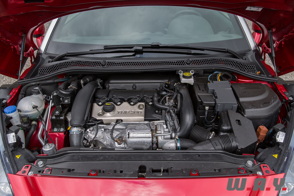 Trois motorisations sont disponibles sur le coupé RCZ. A ma gauche, un diesel 2.0 litres HDi de 163 CV à 3’750 t/min et 340 Nm dès 2’000 t/min accouplé à une boîte manuelle six rapports. A ma droite, deux essence 1.6 litres, de 155 CV à 6’000 t/min et 240 Nm dès 1’400 t/min pour le premier, avec boîte manuelle ou automatique et le désormais bien connu 200 CV à 5’500 t/min, auquel nous avons affaire dans cet essai et que nous retrouvons sous le capot des Citroën DS3 Racing, DS4, DS5 et Peugeot 208 GTI. Ce propulseur se voit accouplé uniquement à une boîte de vitesses manuelle à six rapports. Bien étagée, au guidage ferme et précis, cette transmission permet de tirer avec aisance la quintessence du bloc THP 200. Un vrai bonheur. Souple, coupleux (275 Nm entre 1’700 et 4’500 t/min), il ne rechigne en rien à venir taquiner la zone rouge en conduite sportive. A allure de sénateur, il enroule également avec facilité en jouant sur le couple. Une petite merveille ce moteur !