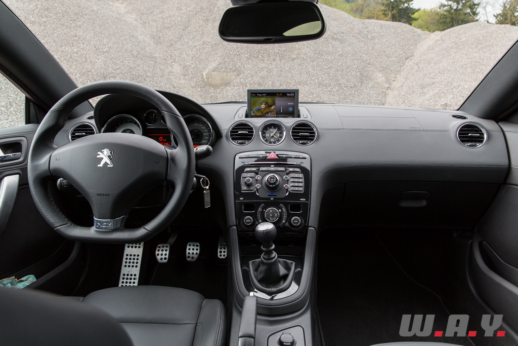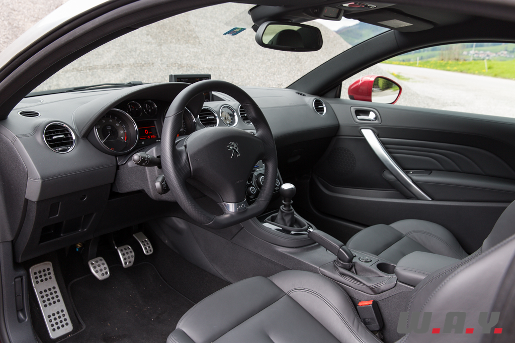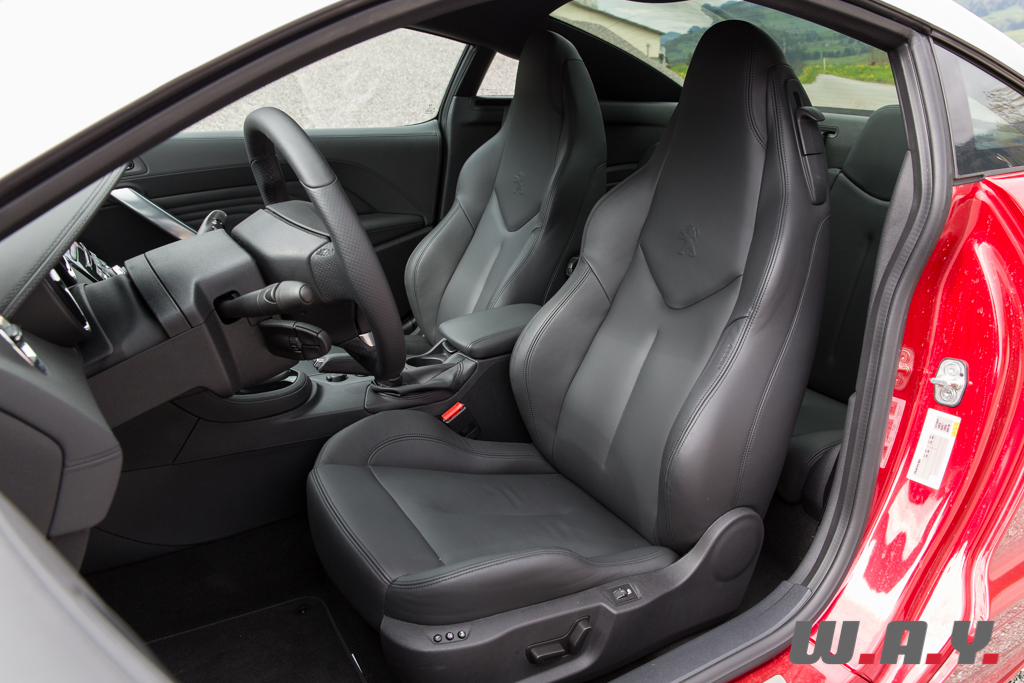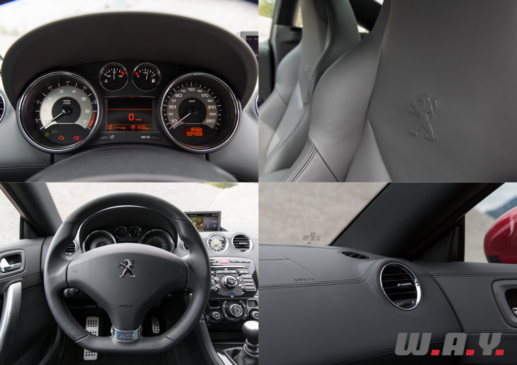 Point de révolution, les nouveautés portent également sur les couleurs des garnissages. Nous y retrouvons donc les magnifiques sièges baquets siglés du lion, une banquette arrière anecdotique tant elle ne sert que de compartiment à bagages supplémentaire et une planche de bord bien léchée. Le choix des matériaux demeure bon, pour ce qui reste dans le champ de vision. De la peausserie sur toute la planche, surpiquée avec précision et ajustée au poil entre les contre-portes et la face afin de ne pas y déceler de décalage. Seuls les plastiques durs et grossiers entre les sièges, dans le prolongement de la console, le bas des contre-portes et sous le tableau de bord dénotent dans cet univers voulu premium.