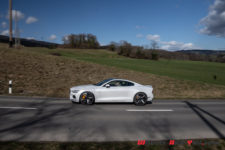 Indépendamment de son apparence exceptionnelle, une des caractéristiques très particulière, c’est le fait que sa coque est conçue en polymère renforcé de fibre de carbone (CFRP). Ainsi, la rigidité de l’ensemble fait merveille, proposant un bon agrément de conduite malgré les 2’350 kg de la belle suédoise.