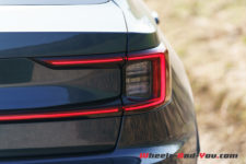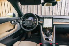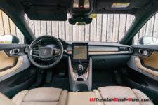 La face avant noir mat très verticale confère une dose d’agressivité alors que la signature lumineuse de la poupe n’a pas d’équivalent. De profil, elle arbore une silhouette à mi-chemin entre une berline et un coupé quatre porte. De 3/4 avant, le galbe des ailes renforce la sportivité de l’auto largement campée sur ses grandes roues de 20 pouces en option (19″ de série). Et le magnifique toit vitré orné du logo lumineux rappelant l’étoile polaire est du meilleur effet.