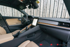 L’intérieur révèle tout de suite son origine scandinave par son caractéristique luxe discret. Ma voiture de presse arbore une option bicolore du meilleur effet, alliant tissu texturé, bois satiné et des sièges chauffants et ventilés avec une sellerie cuir en option. Il convient de relever que, sans l’option cuir, l’intérieur est 100% végan. Il intègre également des matériaux produits à base de matières recyclées.