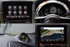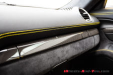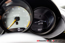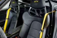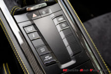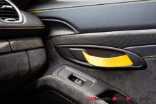 Notre voiture d’essai dispose également du Pack Intérieur carbone, c’est du plus bel effet. Habituellement pas un grand fan de ces traitements, je trouve qu’ici la combinaison du carbone avec les petites touches de jaune est sublime. J’apprécie aussi tout particulièrement les sangles, jaunes également pour le coup, en lieu et place des poignées d’ouverture de portes. Un signe distinctif des déclinaisons extrêmes des autos de Zuffenhausen.