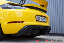 Finalement, et c’est surtout cela qui fait tourner les têtes, un aileron arrière fixe, ainsi qu’un diffuseur avec effet de sol qui intègre la double sortie d’échappement. Cette dernière n’est plus au centre comme la précédente génération ou comme sur sa grande sœur, la 911 GT3. S’il semble que ça perturbe un peu les Porschistes, moi j’avoue que ça me plait ainsi.