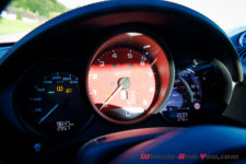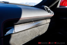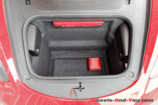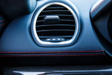 Contrairement à l’extérieur, j’apprécie particulièrement les coutures rouges ainsi que le rappel du compte-tours, lui aussi en rouge. C’est à la fois discret et donne un côté encore plus sportif à l’ensemble de l’intérieur. Tout ou presque est pensé pour que le conducteur se sente dans un cockpit et l’espace quelque peu exigu de cette deux places renforce ce sentiment.