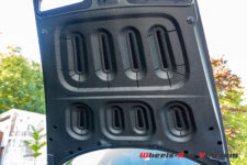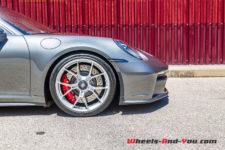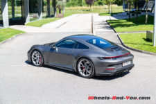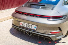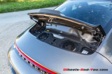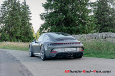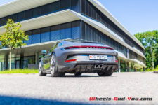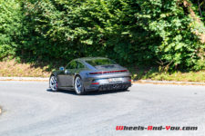 Tout d’abord le bouclier avant qui est tout simplement ultra agressif, directement inspiré de la compétition. Il suffit de mettre une autre 911 à côté, une 992 normale ou même une 991.2 GT3, pour s’en rendre compte. C’est tout d’abord carré et large, puis avec les différentes entrées d’air, ça accentue le côté bestial. En fait, il y a bien que la teinte gris foncé, « Agate Grey Metallic » pour être précis, de notre voiture d’essai qui assagit l’ensemble. Pour l’avoir observé depuis le rétroviseur central en la précédant, je vous promets qu’au volant de cette 992 GT3 la circulation se fluidifiera rapidement devant vous, surtout si en plus vous optez pour une robe flashy.