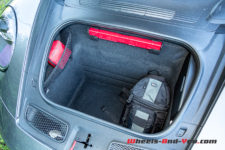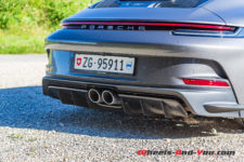 L’arrière est peut-être la partie qui me plait le moins. Sans aileron, ce que je préfère, on observe plus facilement le dessin du pare-chocs et je le trouve un peu trop torturé. J’ai l’impression qu’on a tiré sur l’arrière pour le prolonger et c’est nettement moins harmonieux que sur une GTS par exemple. Je peux aussi constater que c’est plus flagrant sur la Touring, car sur une GT3 normale, l’imposant spoiler arrière cache les traits du fessier de cette 992. Je trouve également que le diffuseur, similaire sur les deux versions de GT3, aurait pu être un brin plus discret sur la Touring, mais je chipote. En tout cas, affublée de la double sortie centrale d’échappement, cette poupe vient compléter avec détermination la sportivité de cette déclinaison GT3.