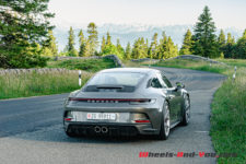 Plus raisonnablement, je me contente du mode Sport, en jouant avec la boite manuelle, avec les vitres ouvertes pour apprécier la sonorité feutrée, mais réelle, du Flat 6. En effet, dans l’habitacle, quelques artifices rendent le tout trop superficiel à mon goût. Rien de tel que les plaisirs simples… Cette 992 GT3 Touring, boite manuelle, et une route de montagne suffisamment torturée pour cruiser à très bon rythme tout en respectant les limitations… un véritable régal que quasiment plus aucune voiture moderne ne propose de nos jours et c’est vraiment regrettable.