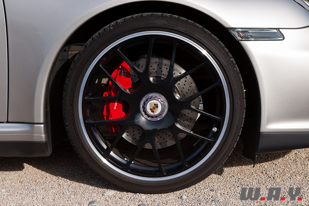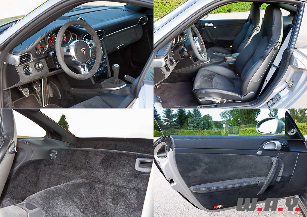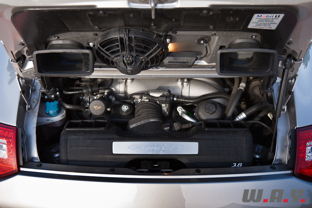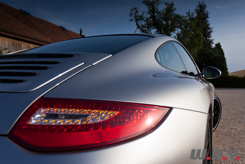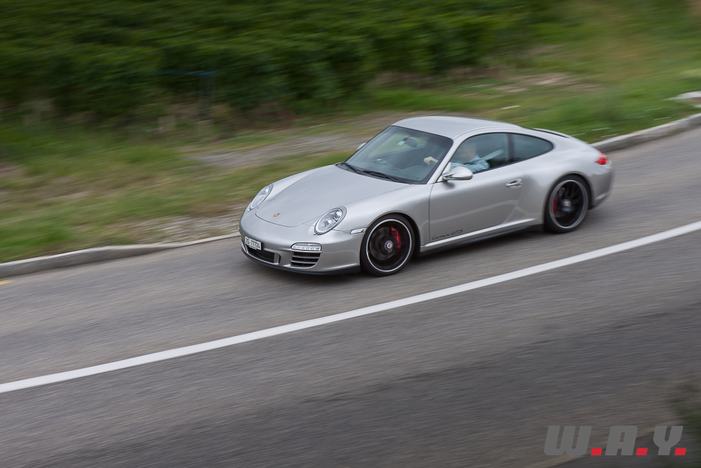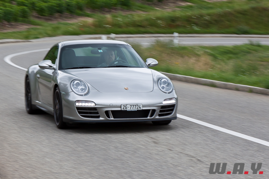 Il suffit d’un quart de tour de clé pour comprendre ce qui fait de la 911 une voiture unique. Le râle rauque et métallique, si caractéristique du Flat 6 s’ébrouant, dériderait un Shar Pei… D’une cylindrée de 3.8 litres, ce bloc est doté de l’injection directe d’essence, technologie adoptée avec la phase II de la 997. La puissance maximum de 408 CV à 7’000 t/min est atteinte grâce à un nouveau système d’admission, une gestion électronique revue et la modification des culasses. Le couple reste identique à celui de la Carrera S, 420 Nm, et est disponible dès 4’200 t/min jusque vers 5’500 t/min.