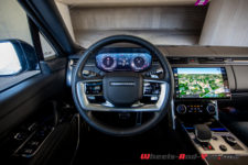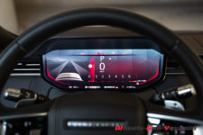 Ça vient notamment d’un bel écran 13,1 pouces placé au centre du tableau de bord et qui affiche le système infodivertissement Pivi Pro. Ce dernier est ultra complet, radicalement plus rapide et permet de contrôler toutes les fonctions de l’auto. Avec la finition Autobiography de notre voiture, je vous garantis que c’est Byzance. En plus des multiples menus liés à la potentielle conduite offroad (pas sûr que beaucoup de propriétaires emmèneront leur Range hors des sentiers battus), je note l’excellent système de caméra 360 degrés. En lien avec cela et chose qui m’a particulièrement amusé, la possibilité de gicler la caméra située à l’arrière afin de la nettoyer. Absurde me direz-vous mais pas du tout, c’est plutôt une confirmation de l’importance donné à chaque détail. Ça pourra se révéler très pratique lorsque vous aurez à manœuvrer pour atteler une remorques par exemple.