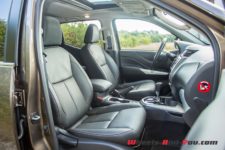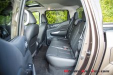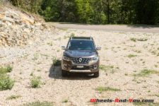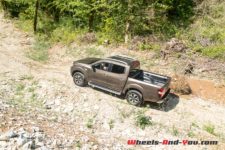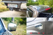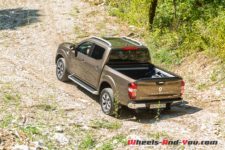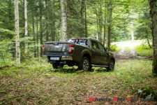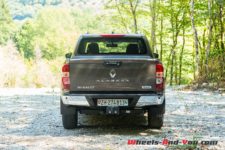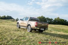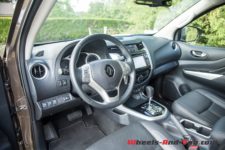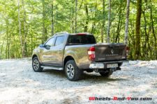 La partie postérieure est très traditionnelle, avec deux colonnes de projecteurs et un bouclier au format contenu, fini chromé sur notre modèle d’essai. Le débattement entre les roues et les arches est particulièrement conséquent, signe clair de la capacité de l’Alaskan à accepter de lourdes charges sur le pont arrière, en plus de lui conférer une habilité à se mouvoir facilement en milieu dégradé.