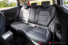 Dans notre modèle en finition Intens, la sellerie bi-ton tissus et simili-cuir est proposée de série. Avec ses surpiqûres et ses différentes textures, le résultat est très élégant. Je suis même agréablement surpris par le confort offert par les sièges de cette nouvelle Clio. Les places arrière bénéficient d’un dossier astucieusement creusé aux places avant pour offrir plus d’espace. Seulement ça ne suffit pas lorsque le conducteur fait plus de 1m80. Là, l’espace vient vraiment à manquer.