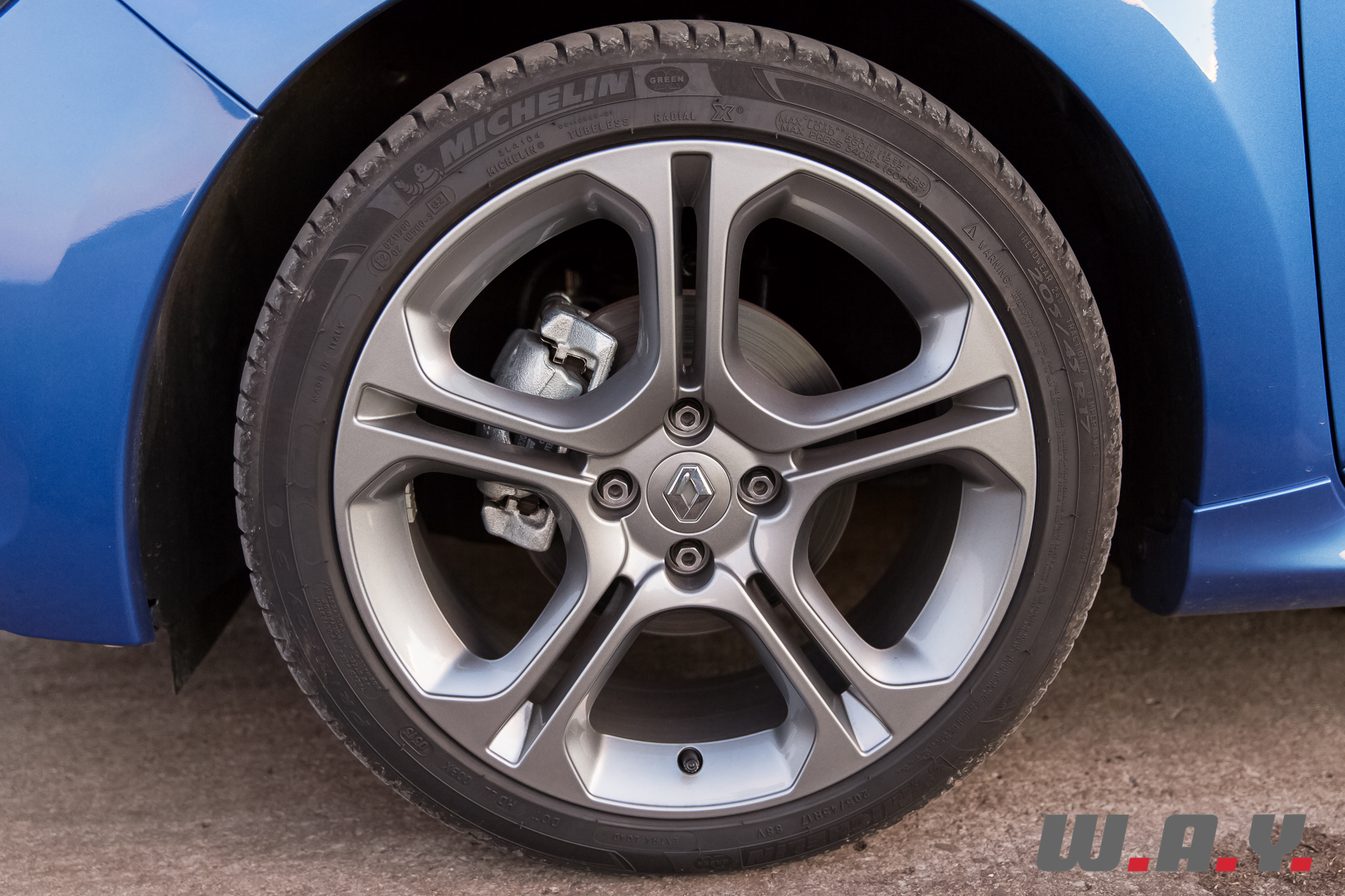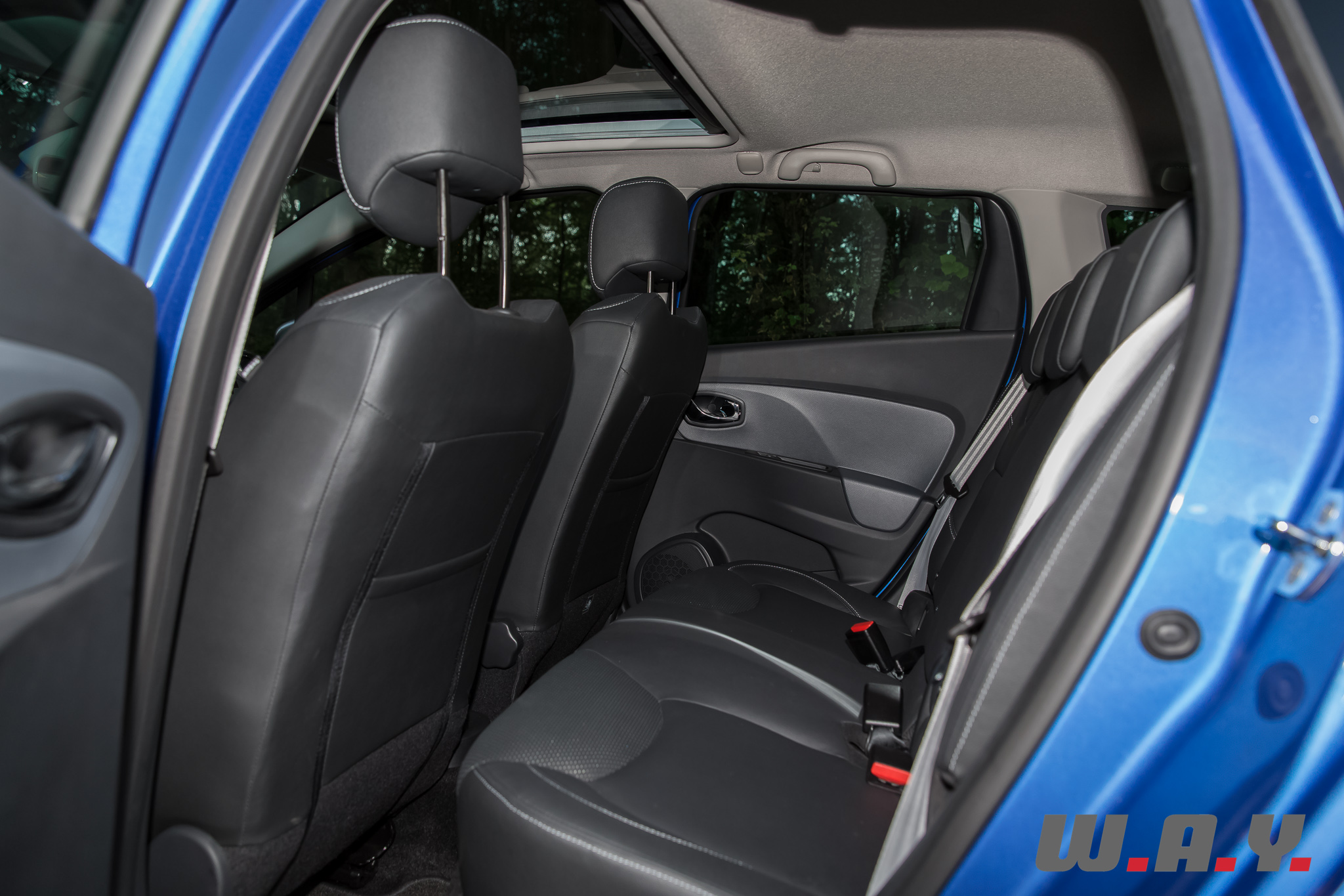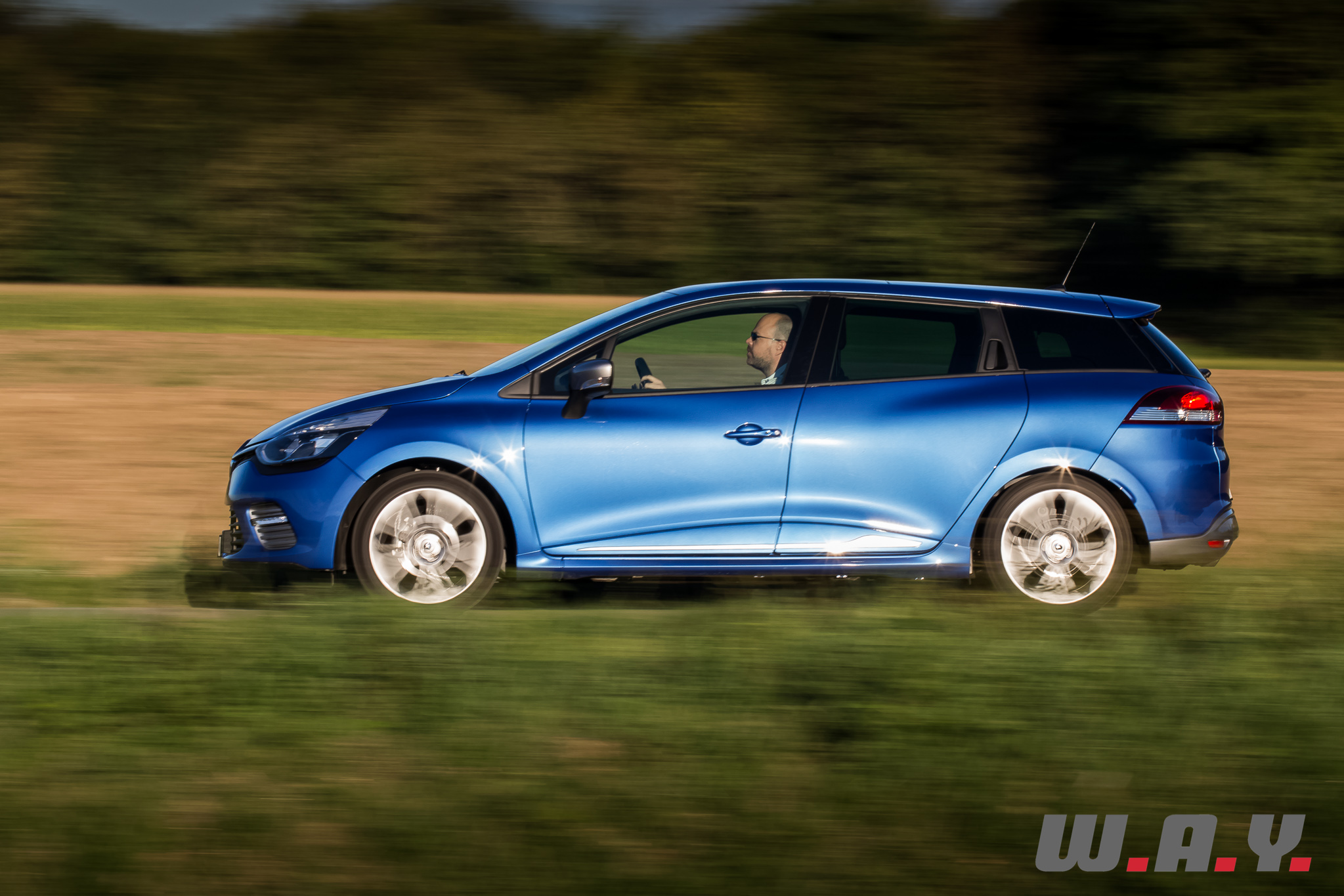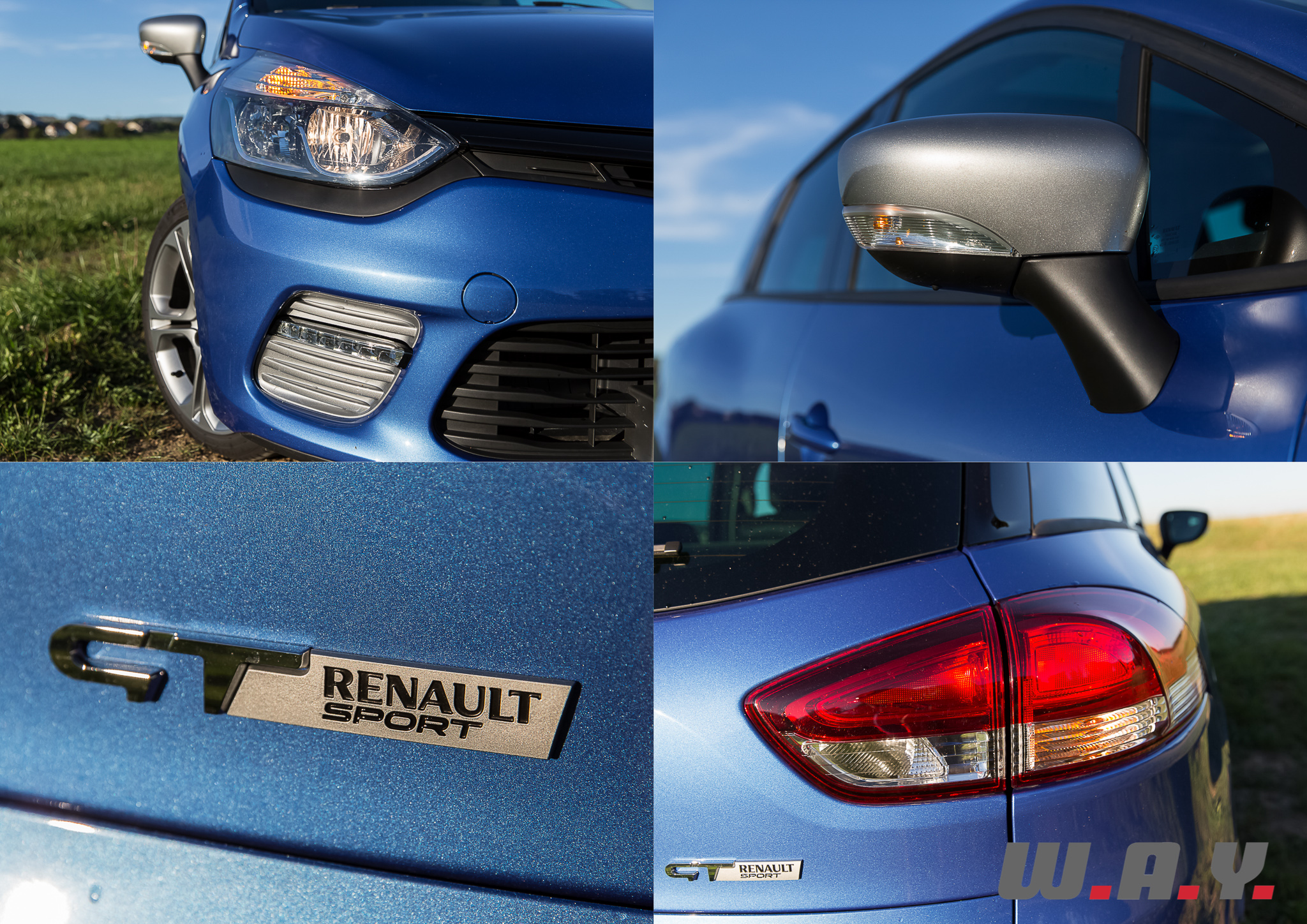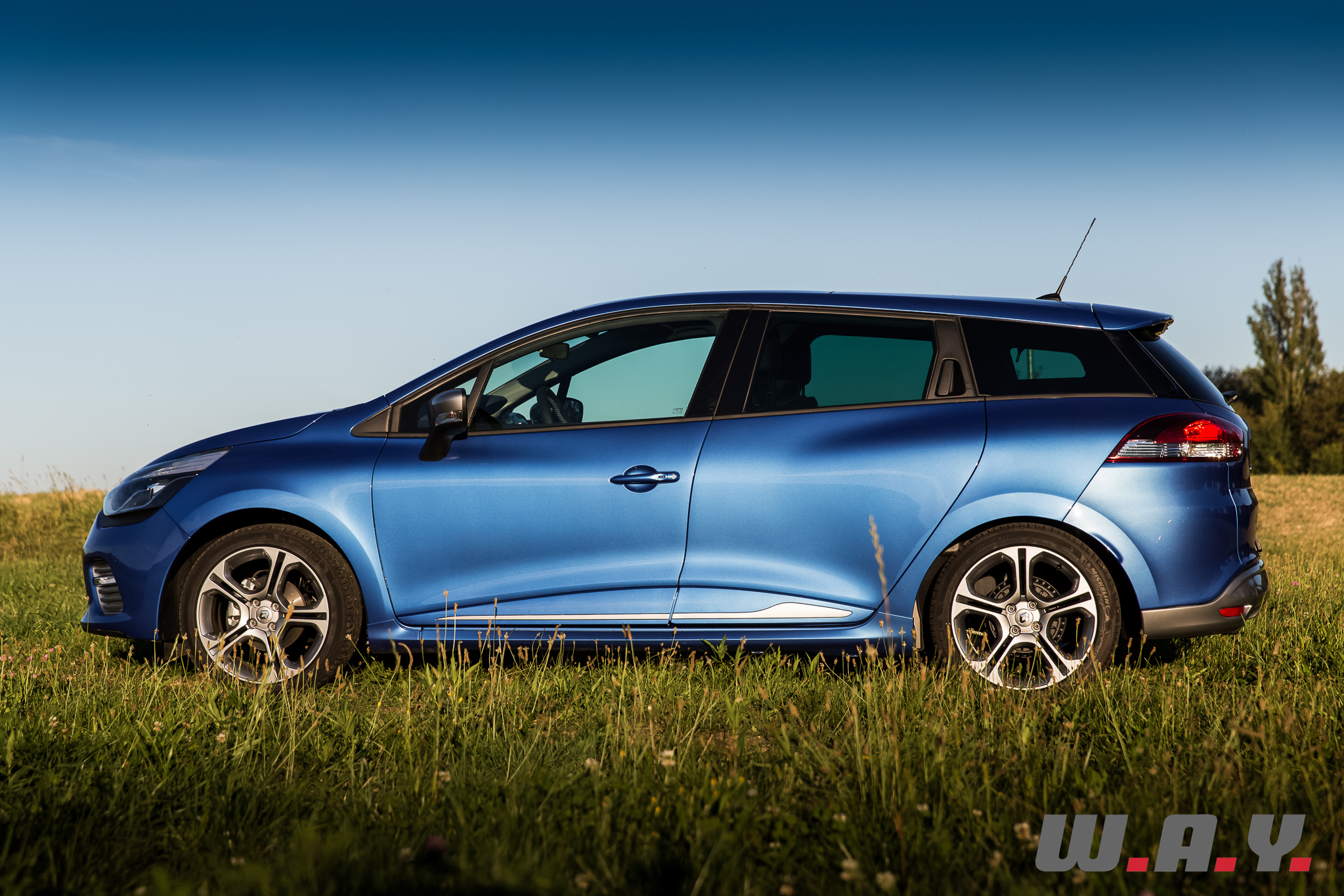 D’emblée, ce magnifique « Bleu Malte » qui habille notre petit break attire l’œil. Sous le soleil de fin de journée les reflets sont magnifiques, les lignes élégantes et réussies du modèle sont mises en valeur. Ajoutons que cette version « GT » dote notre Clio Grandtour de boucliers spécifiques, caractérisé à l’avant par des LED déportés et à l’arrière par un diffuseur contrasté et une double sortie d’échappement. Les jantes de 17’’ « Silverstone » font également partie du lot.