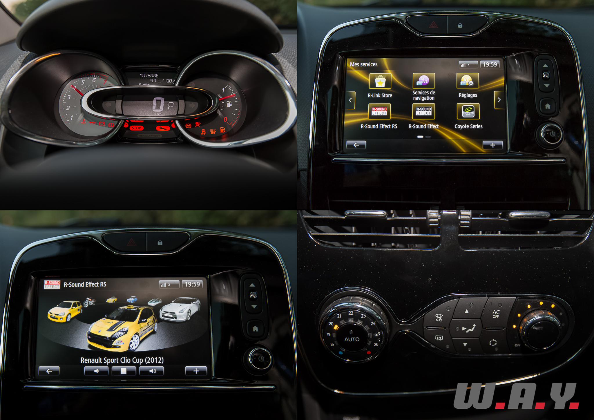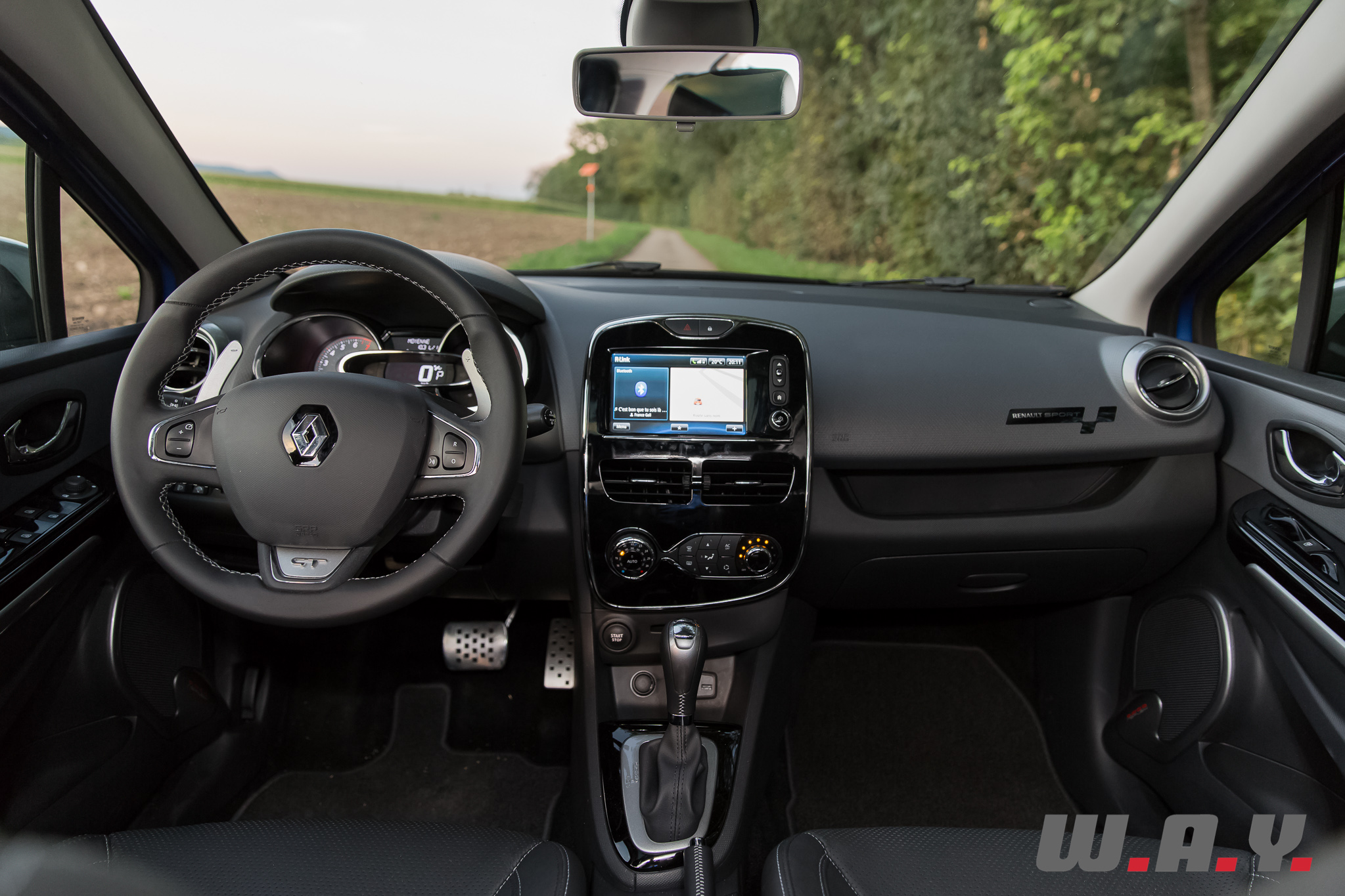 A contrario, la Clio GT fait le plein d’équipements ! Climatisation, GPS avec interface « TomTom », système de communication « R-Link » que nous avons déjà découvert sur la R.S. et le Captur, tout est de série. Y compris le fameux « R-Sound Effect » qui vous permet de choisir, parmi une kyrielle de modèles du groupe Renault au sens large, le son du moteur diffusé par les hauts-parleurs qui collera le mieux à vos envies du moment… (Clio V6, Clio Cup, Alpine, R8 Gordini, Nissan GT-R, etc.). Un gadget rigolo à condition de bien régler le volume…
