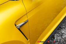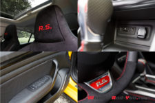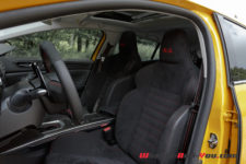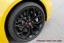 De profil, les lignes sont tendues et la silhouette râblée dégage une impression de puissance contenue. De face et de dos, les larges ailes posent la voiture et ne laissent planer aucun doute quant à son positionnement de sportive pur jus. Les jantes aluminium de 19 pouces noires au design Interlagos contrastent agréablement avec le Jaune Sirius de notre modèle de test. Je trouve que cette teinte sied très bien à la voiture, mais ma préférence va à l’Orange Tonic, tout aussi exclusif mais encore plus explosif au regard.